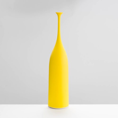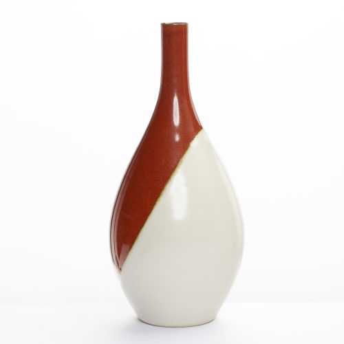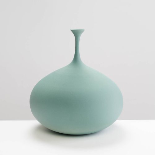 This stoneware carafe is wheel-thrown, then salt glazed and fired in a wood kiln. The combination of the salt and wood firing gives a glossy textured surface.