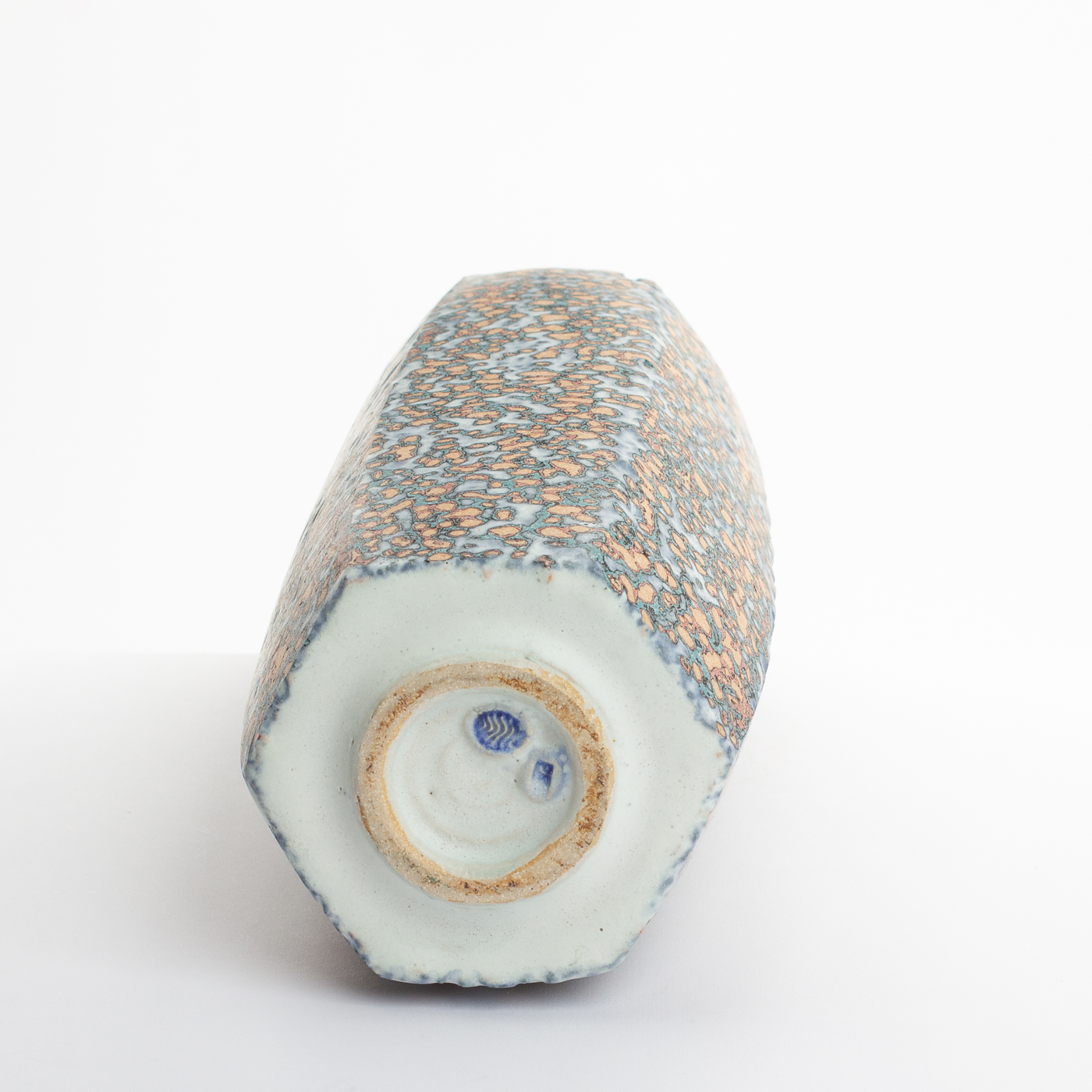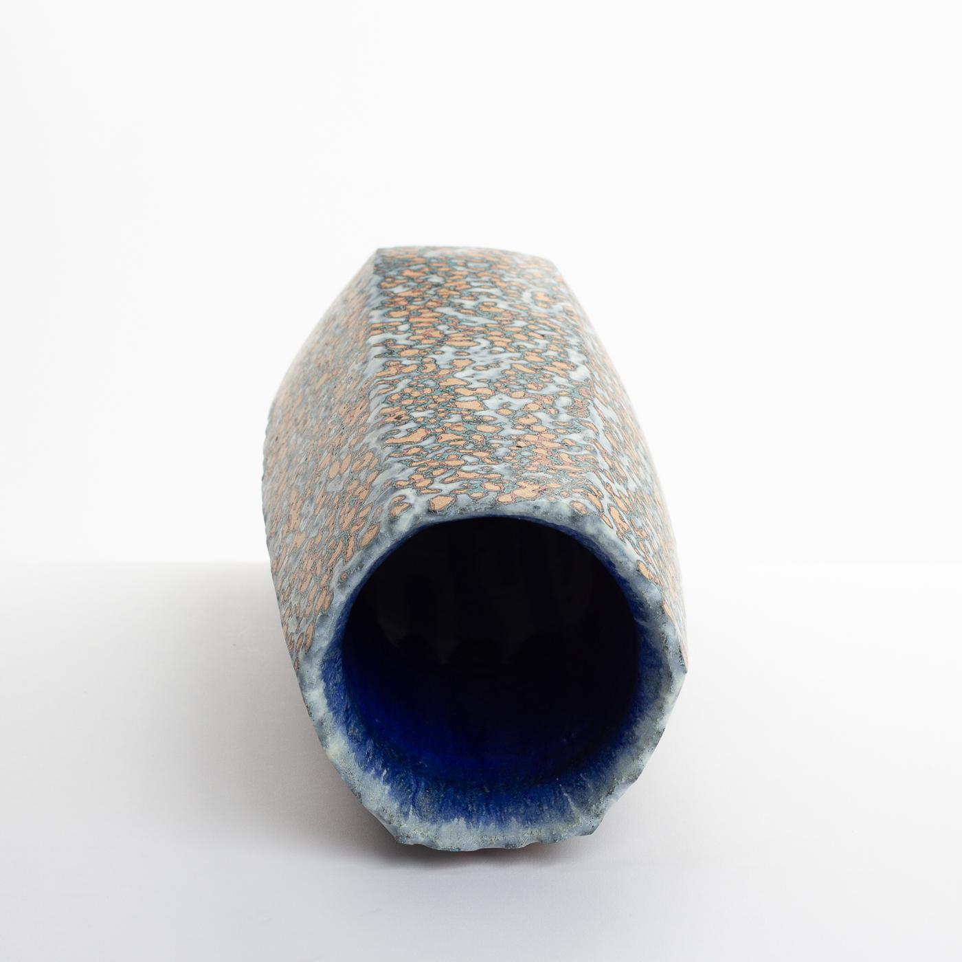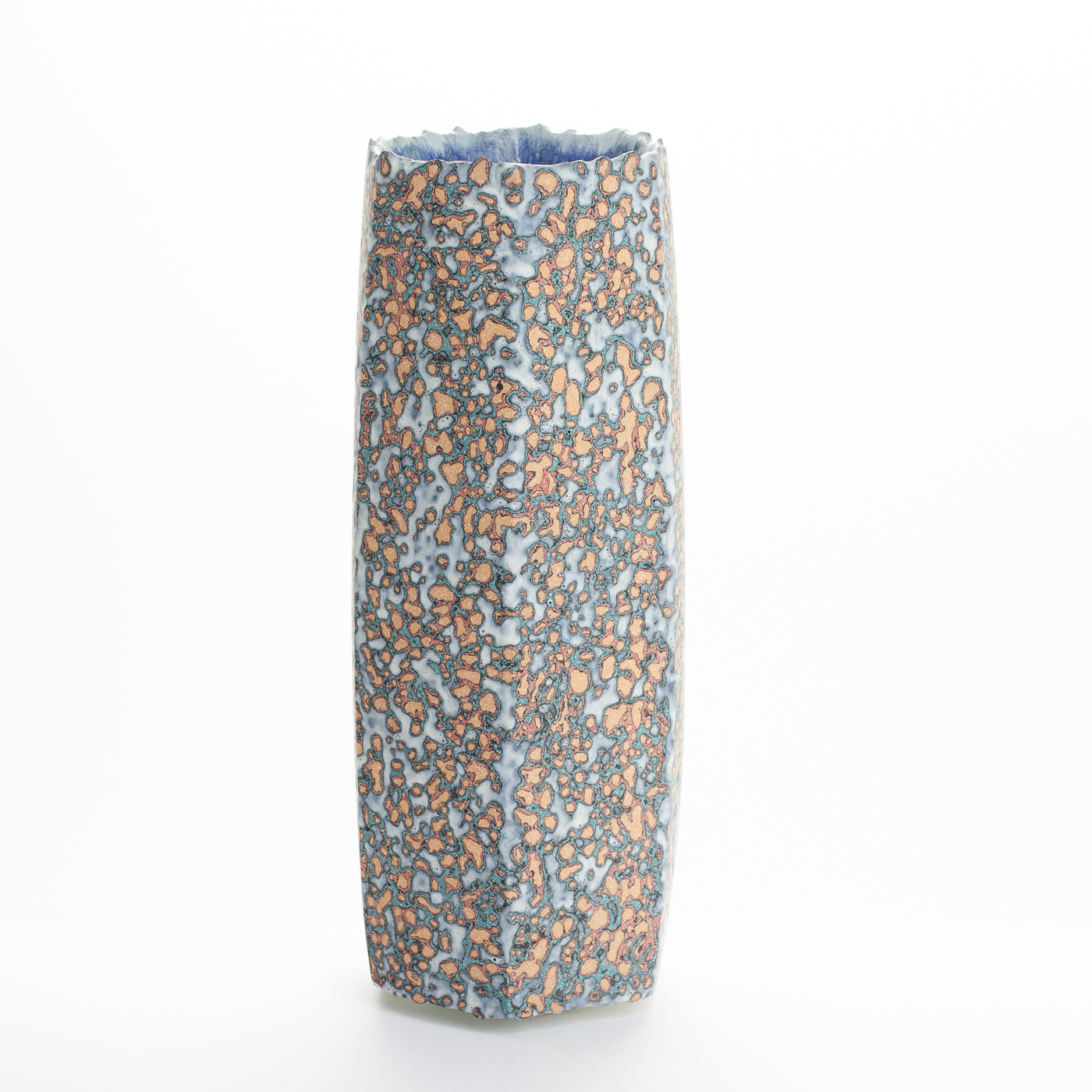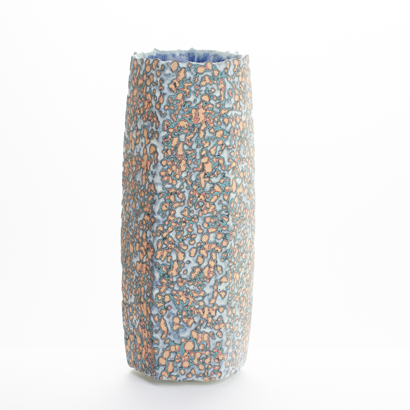 The markings on this wheel-thrown vessel are achieved through coloured clays built up in layers prior to firing to create textural surfaces. This is then ground back to reveal the intricate patterns within the structure, and leaves a marble-like finish.