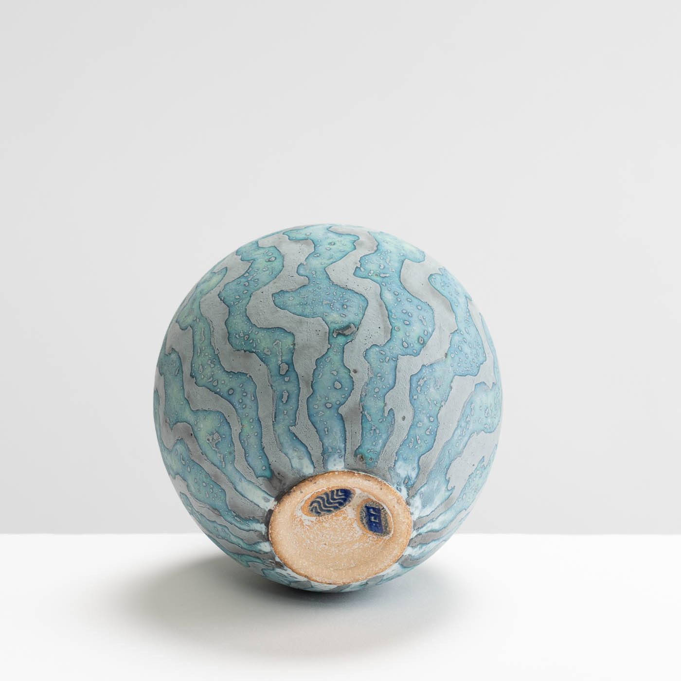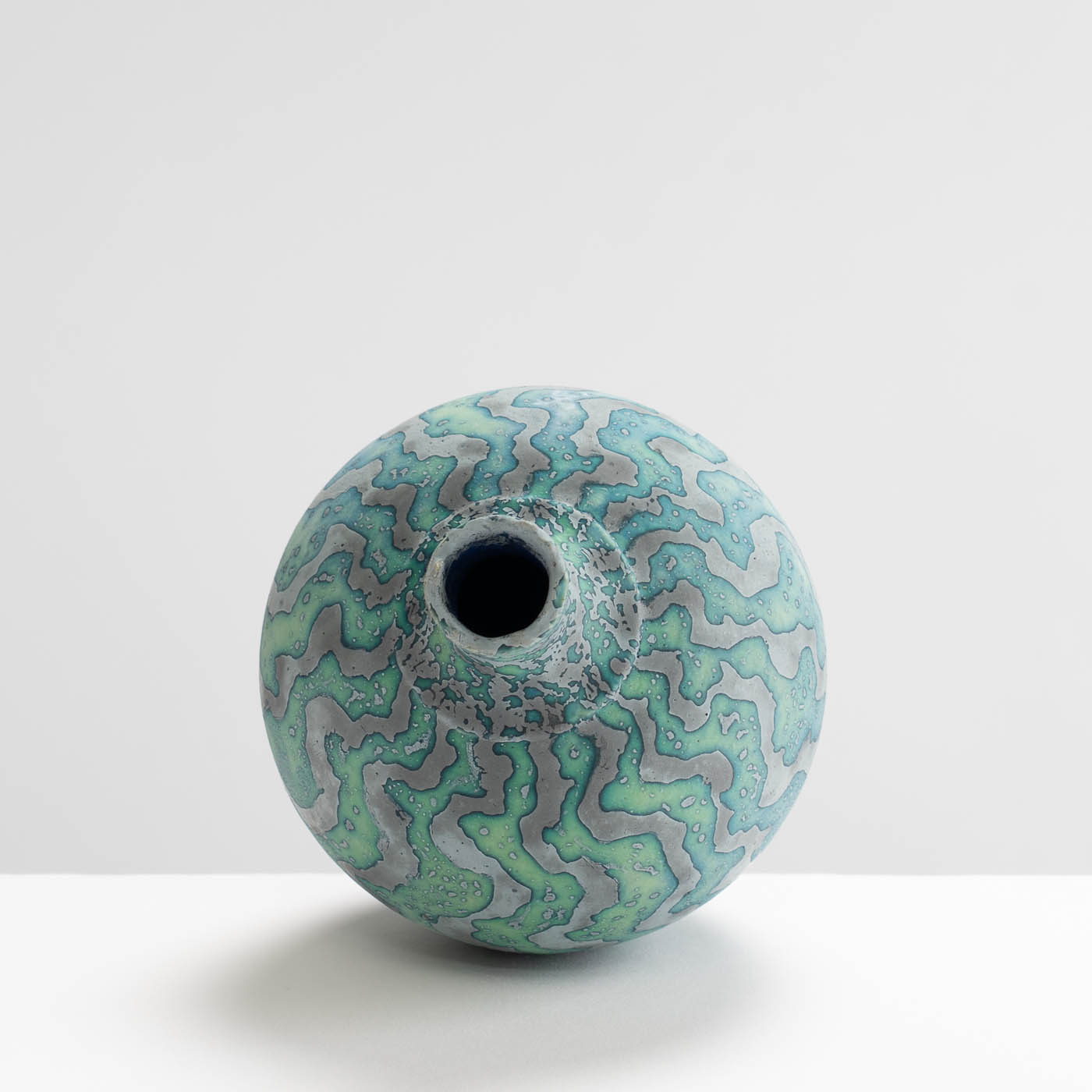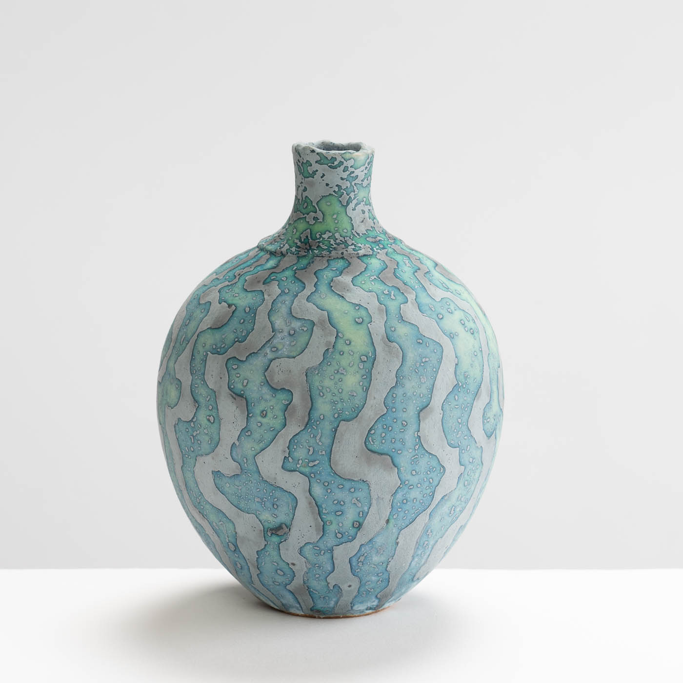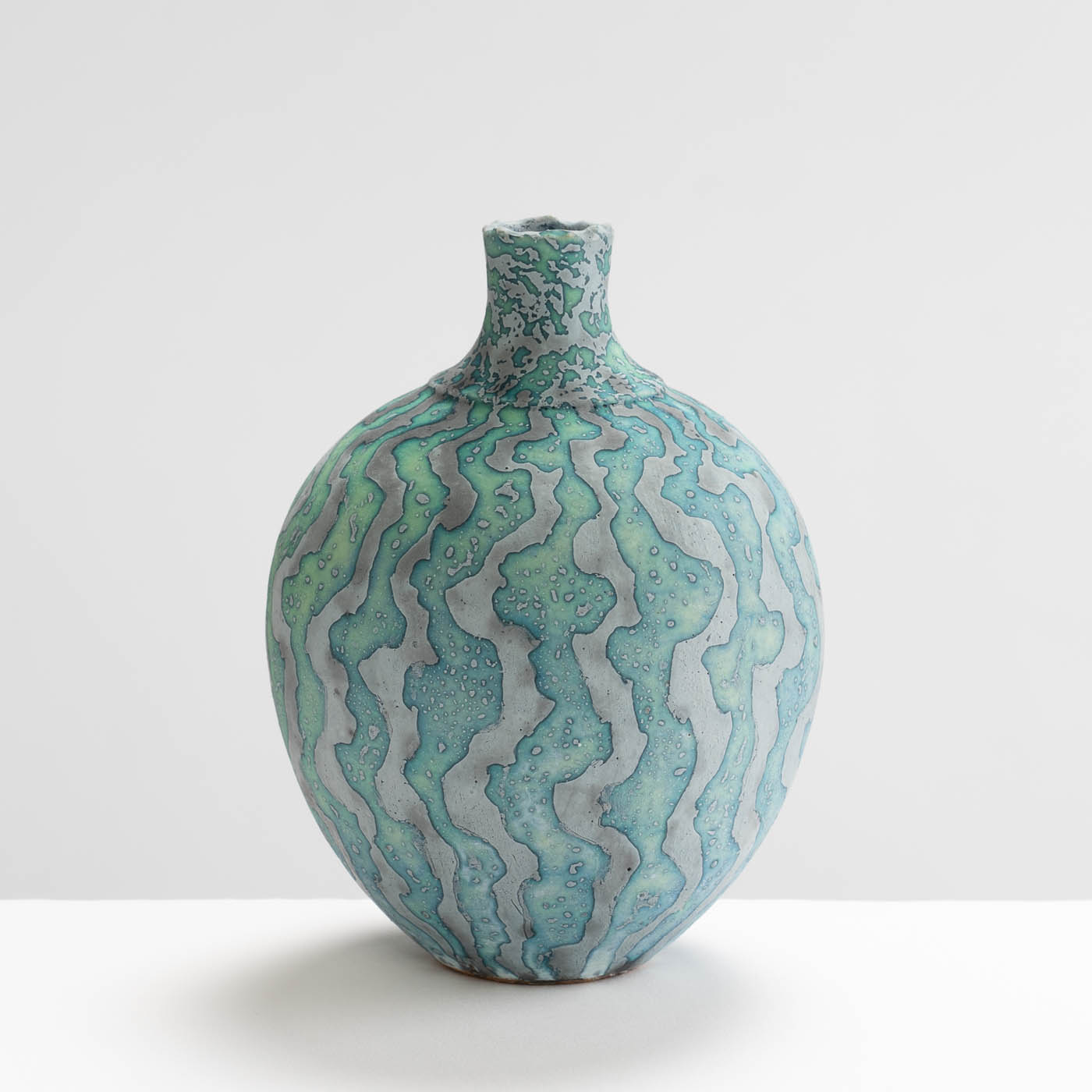 Contrasting coloured markings with a wavy design envelop this vessel, radiating from the base to the opening, creating a naturally mesmerising effect. Wheel-thrown and decorated using Peter Beard’s signature wax resist technique.