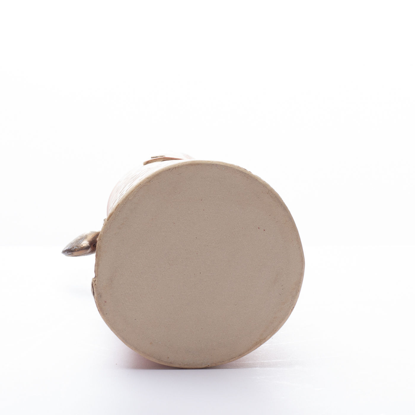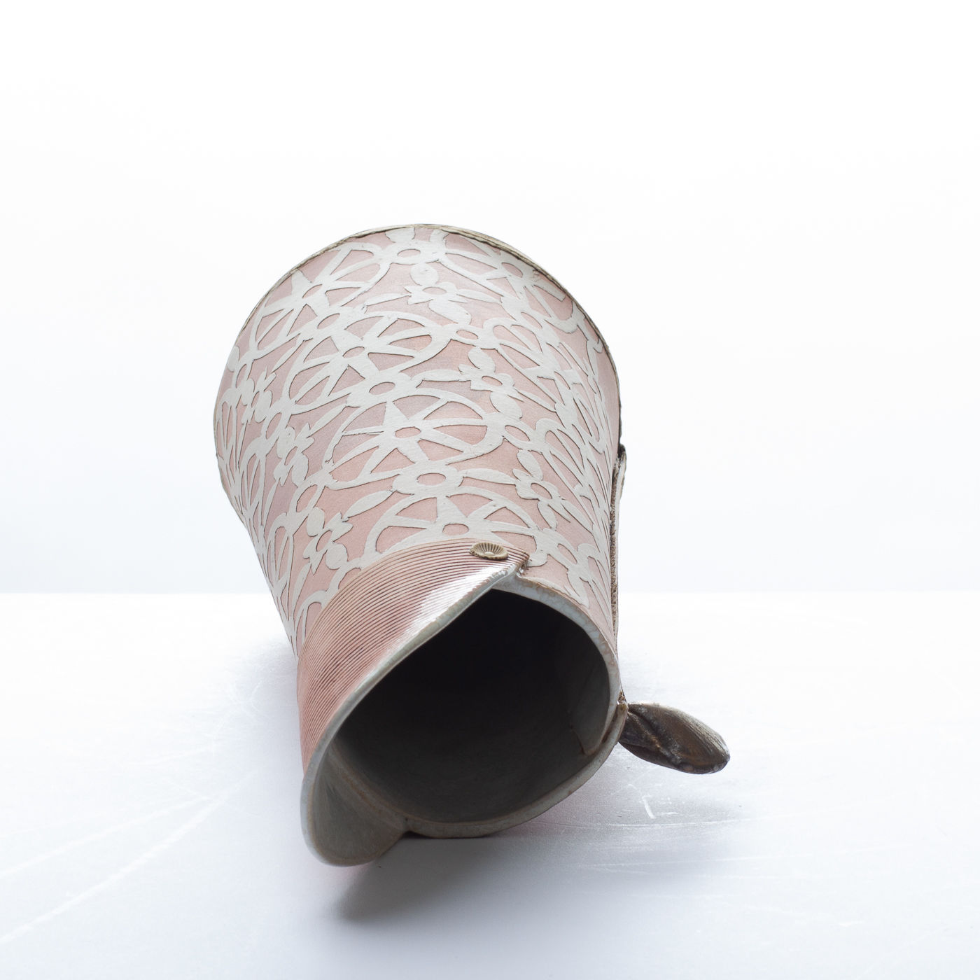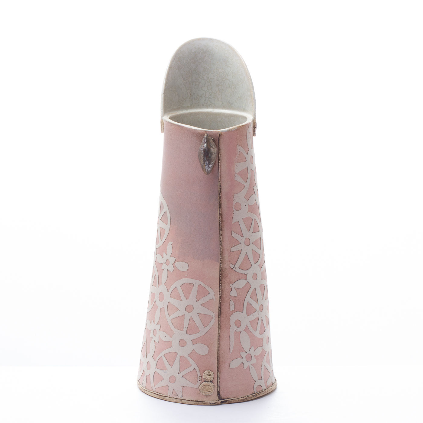 This stoneware jug is slab-built and highly decorative with a pale velvety colour and intricate, hand-cut porcelain overlays. It features a finely crafted shell ‘handle’ in bronze glaze.