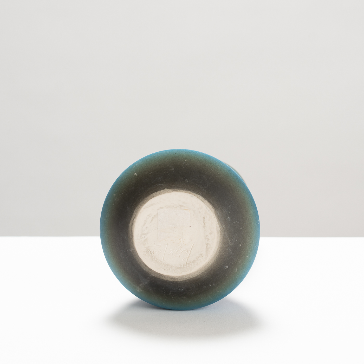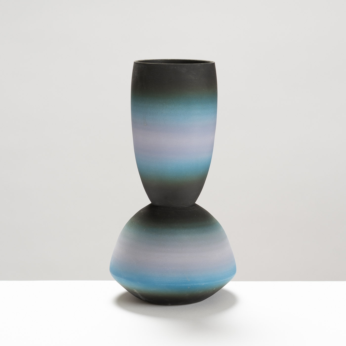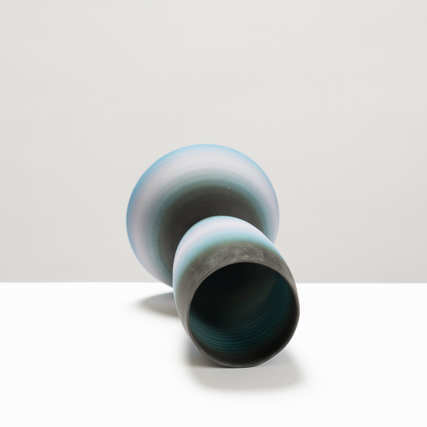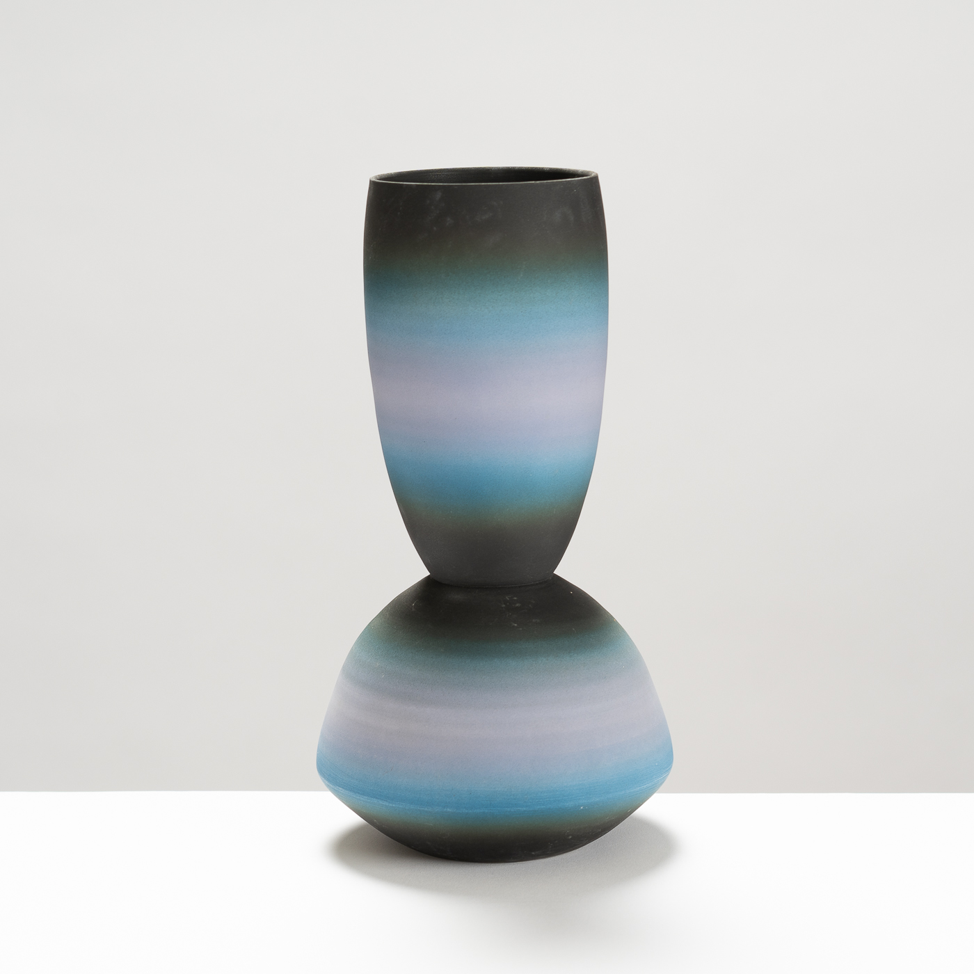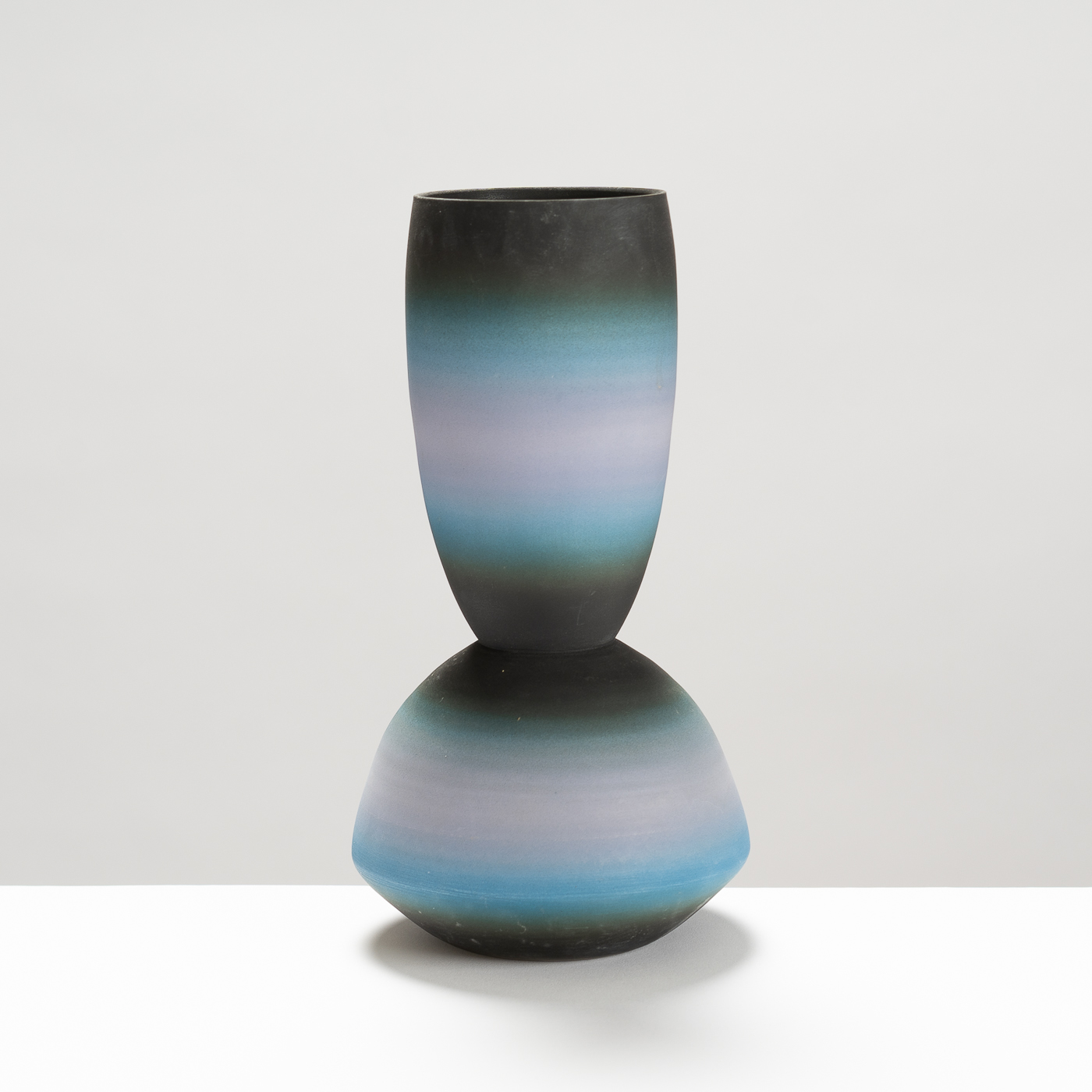 This vessel is wheel-thrown in porcelain, unglazed, and finished by hand-sanding and polishing. Balance between form and surface is achieved through the subtle and harmonious gradation of hues echoing skies, capturing various points of atmosphere, weather, or times of the day.