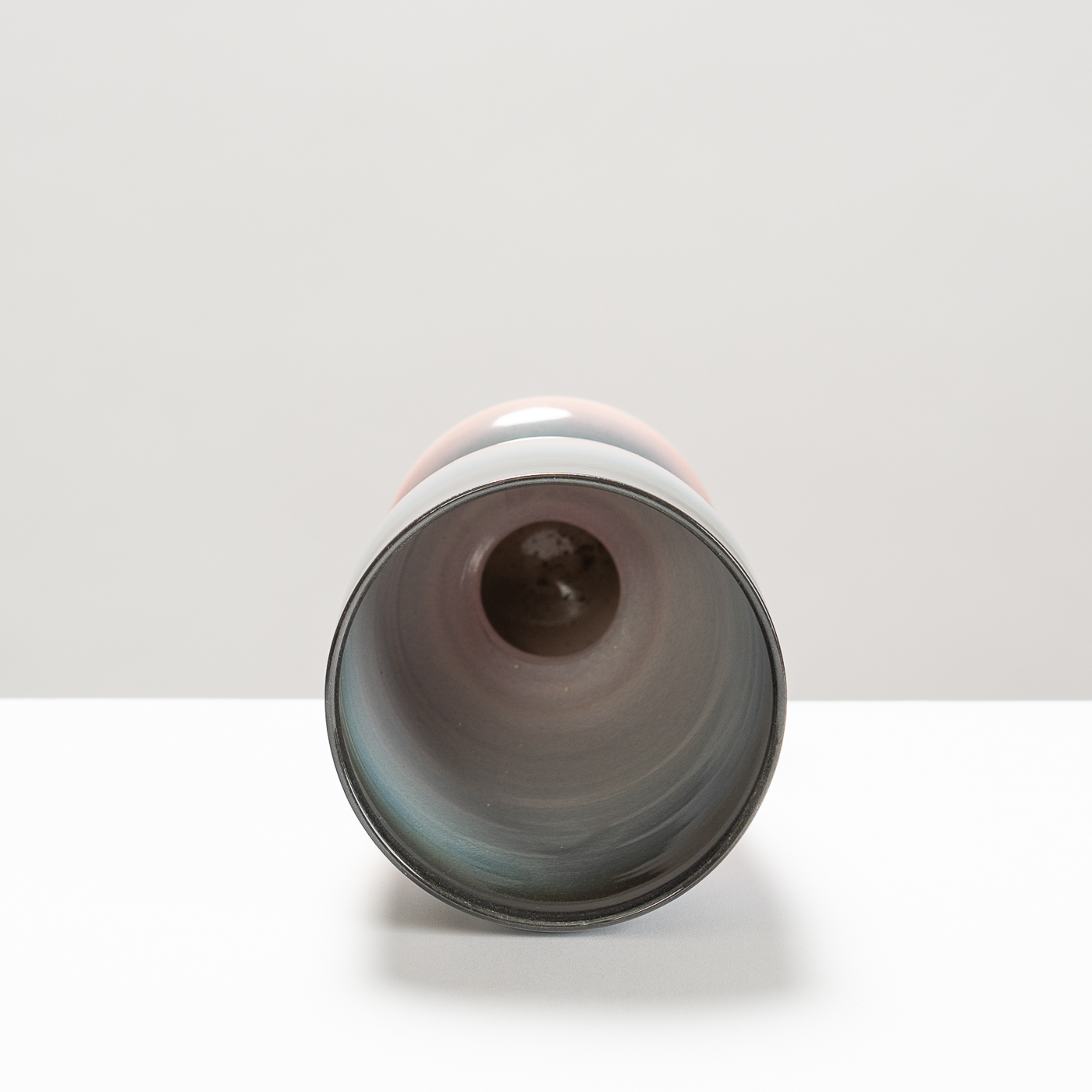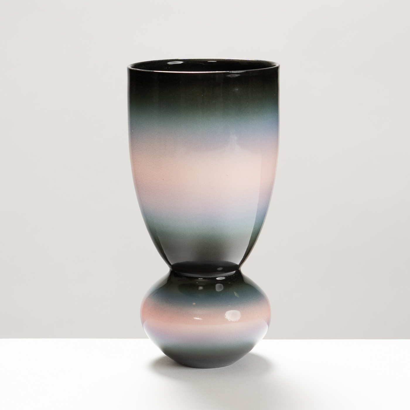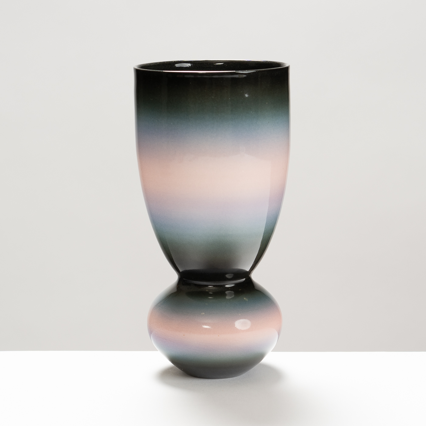 This vessel is wheel-thrown in porcelain, and finished with glaze. Balance between form and surface is achieved through the subtle and harmonious gradation of hues echoing skies, capturing various points of atmosphere, weather, or times of the day.