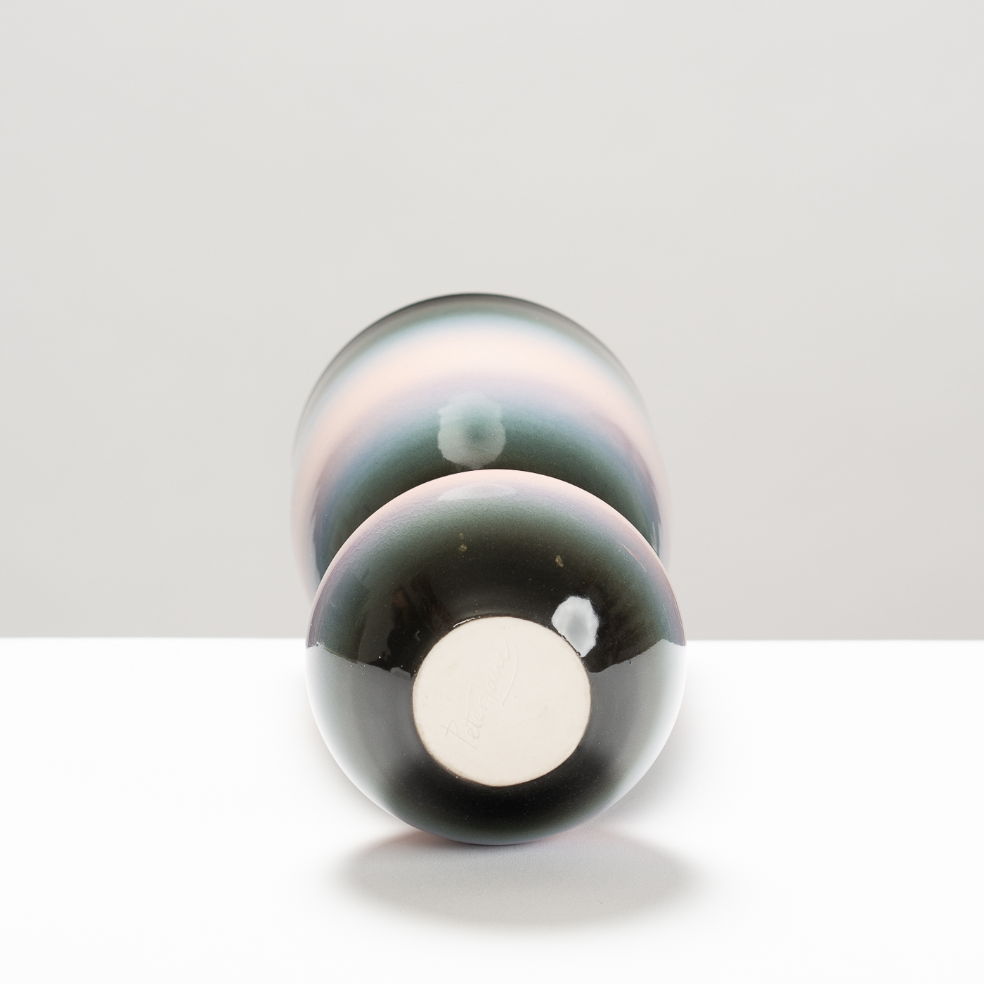 Porcelain, with its fine texture, purity and whiteness, allows Peter to explore relationships between form and surface in a way that is more rewarding than with any other clay. Wheel-thrown vessel forms offer infinite opportunities for subtle variations, but his particular concern, while attempting to achieve harmony and balance in the work, is to express his feelings for the natural world through the positive radiation of light and colour.