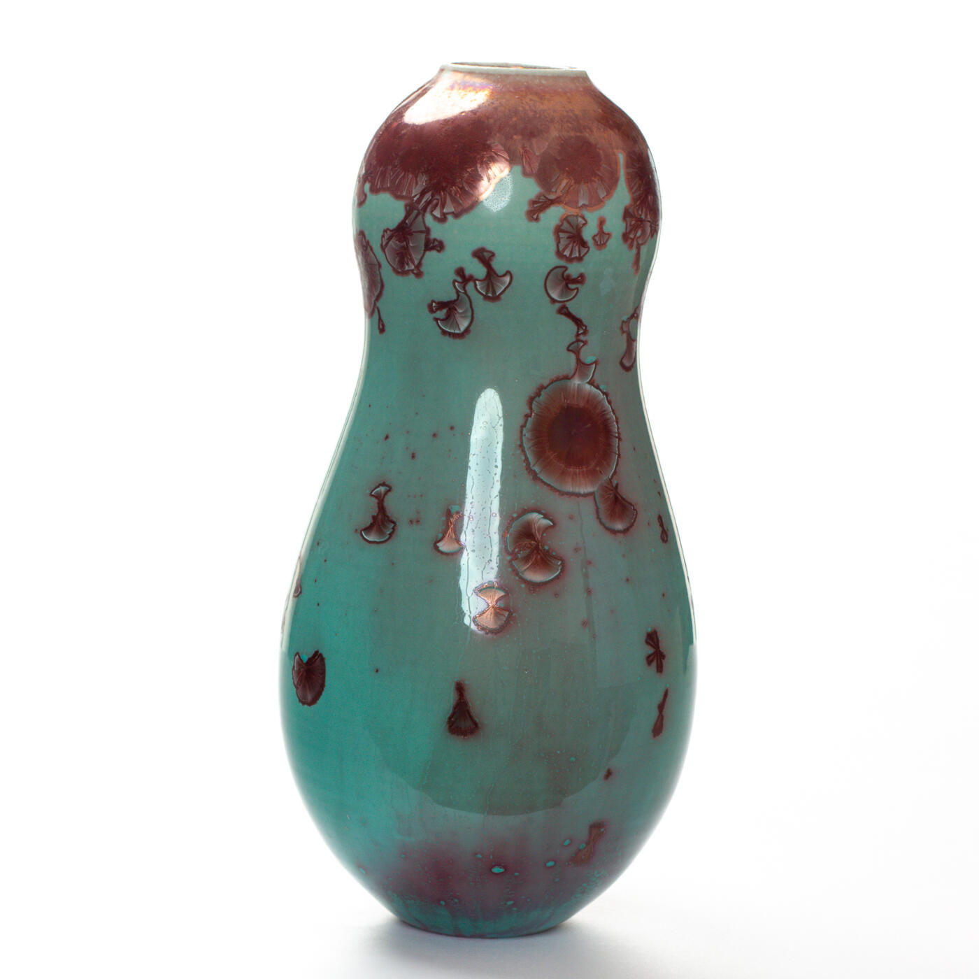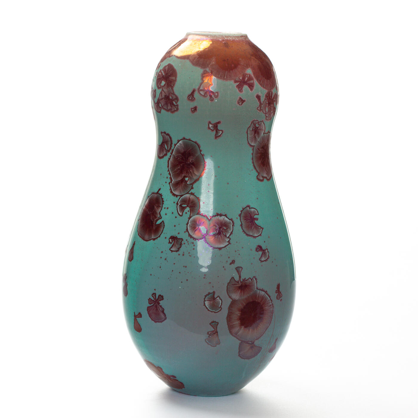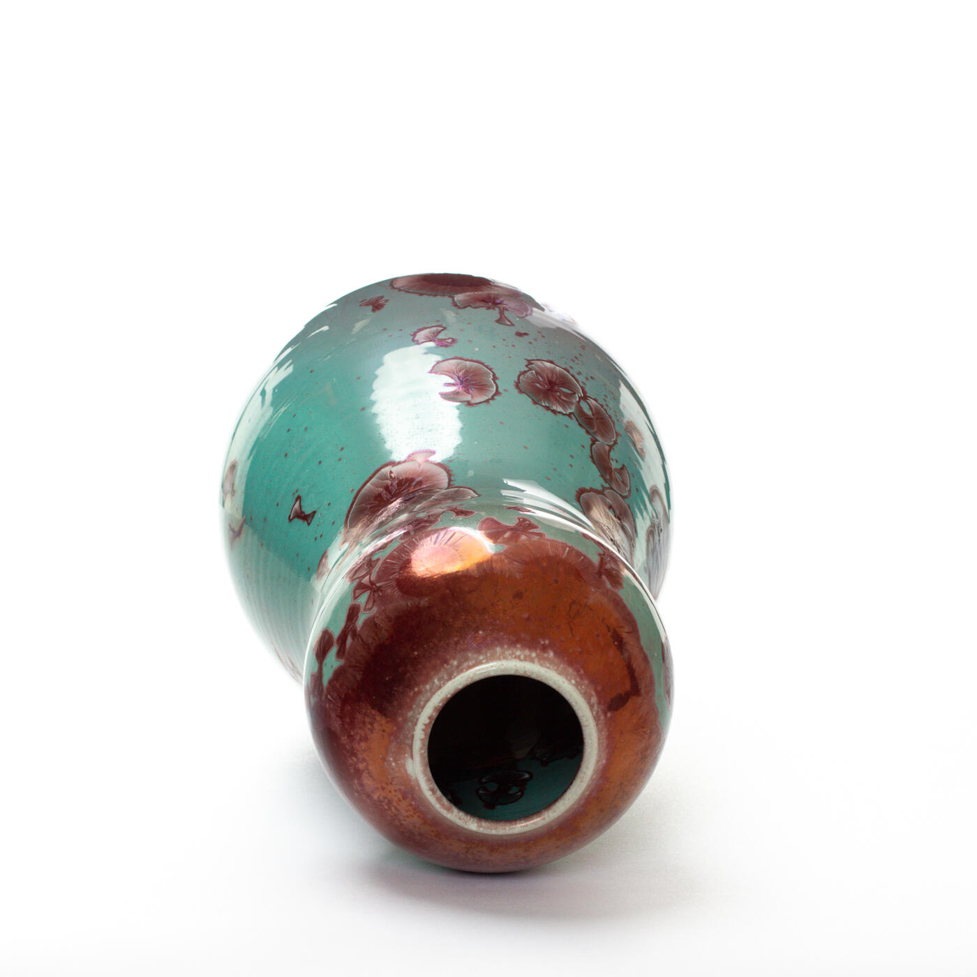 This porcelain vase is a fine example from a master of crystalline glazing. The form itself is exquisitely thrown and the stunning crystalline glaze is highlighted through the use of contrasting colour.