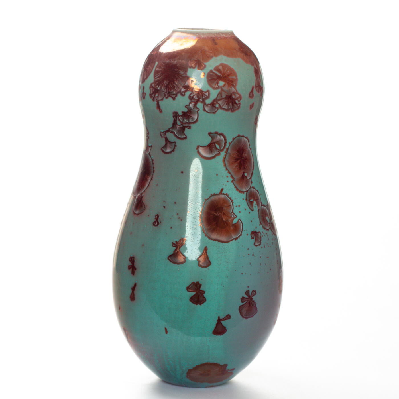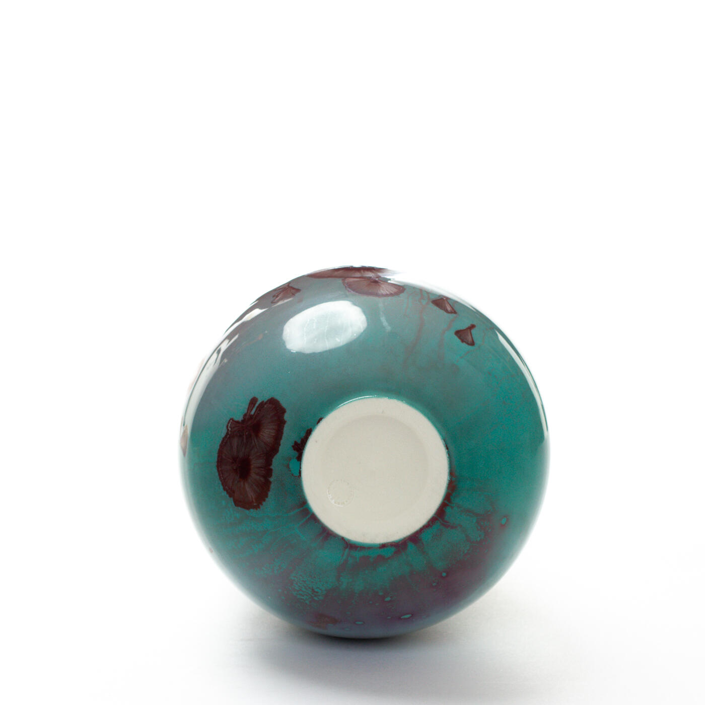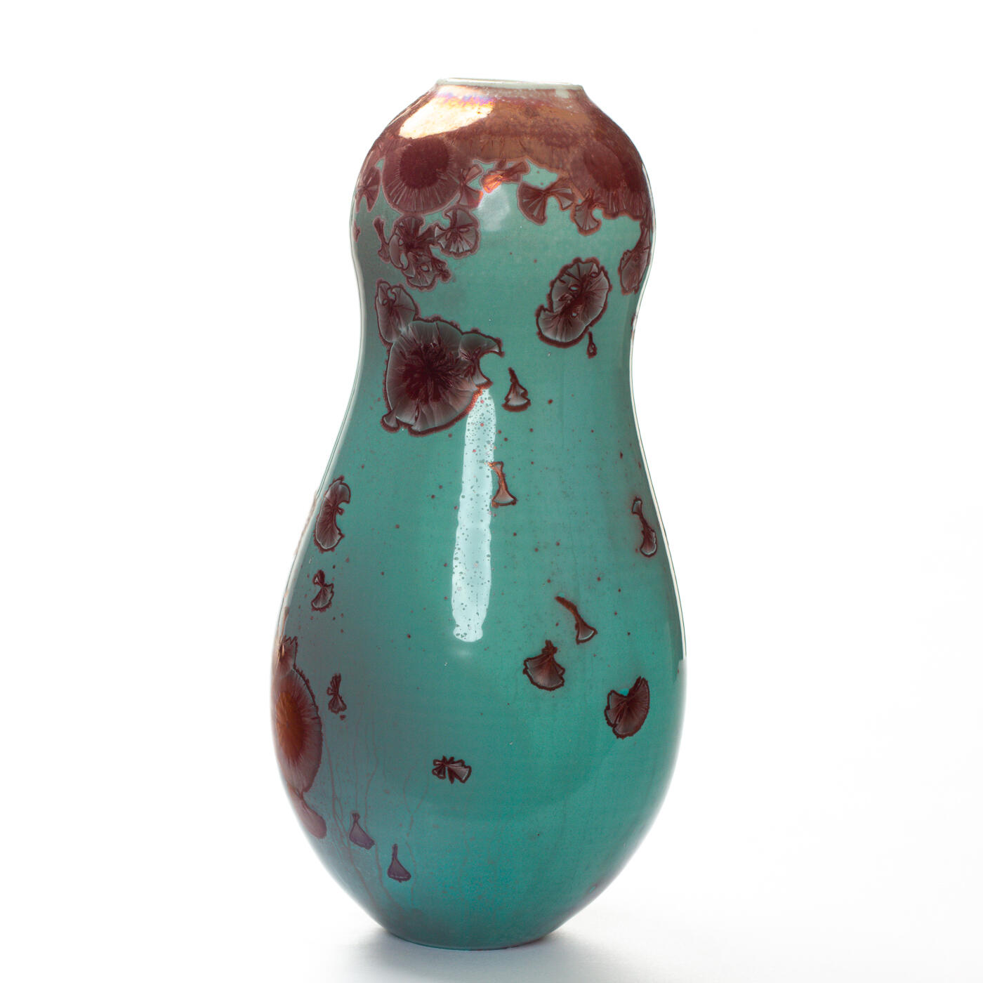 This porcelain vase is a fine example from a master of crystalline glazing. The form itself is exquisitely thrown and the stunning crystalline glaze is highlighted through the use of contrasting colour.
