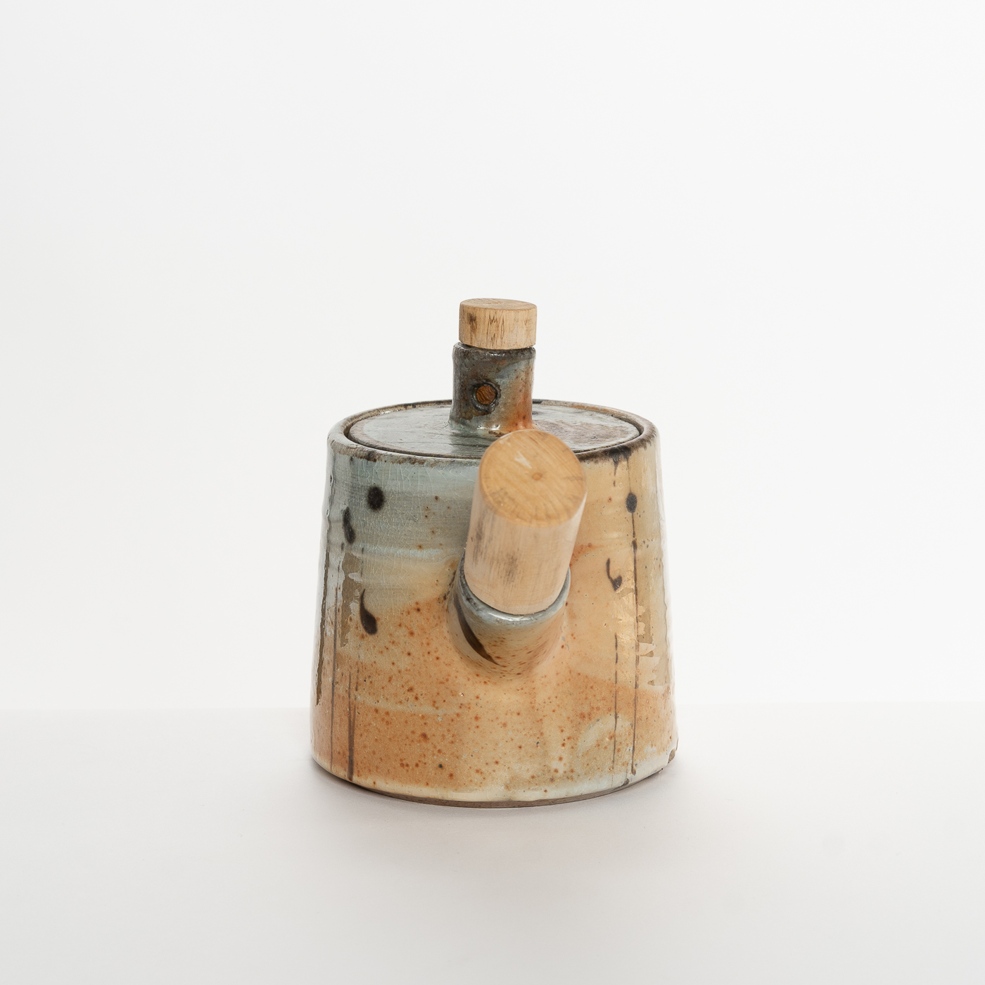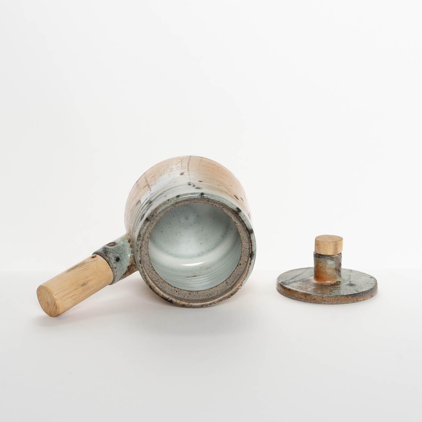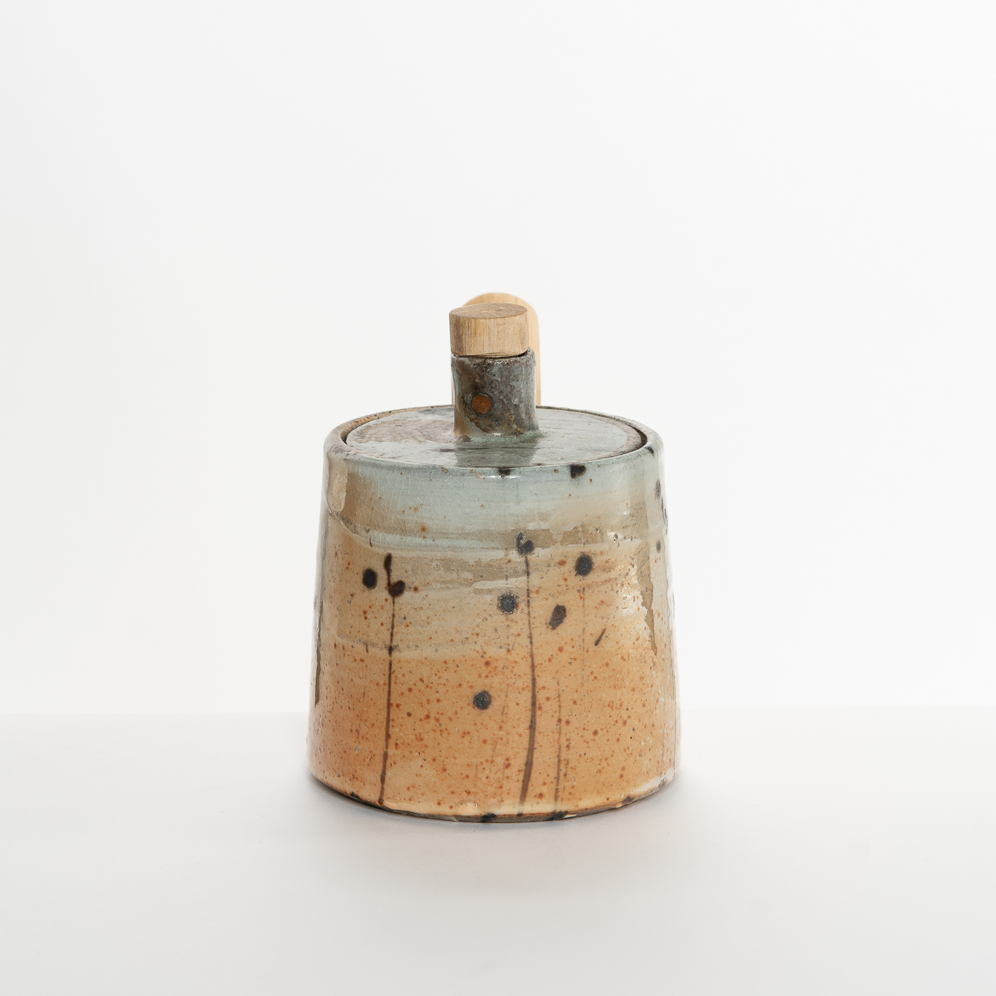 This lidded jar is wheel-thrown in stoneware clay, and features a wooden handle and knob. It is decorated with slips and a shino glaze, then wood-fired.