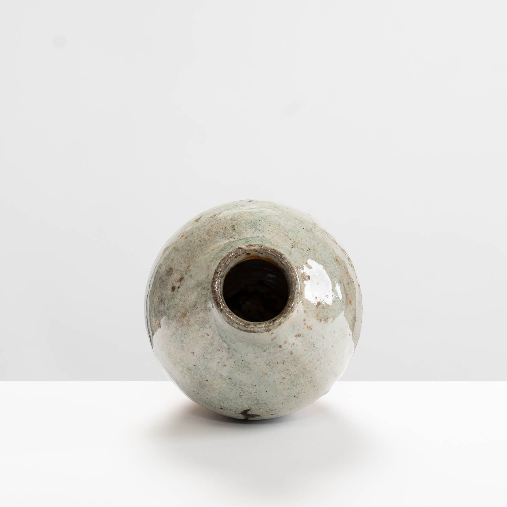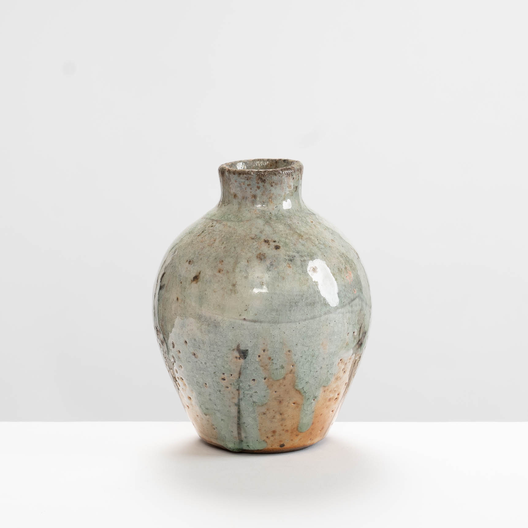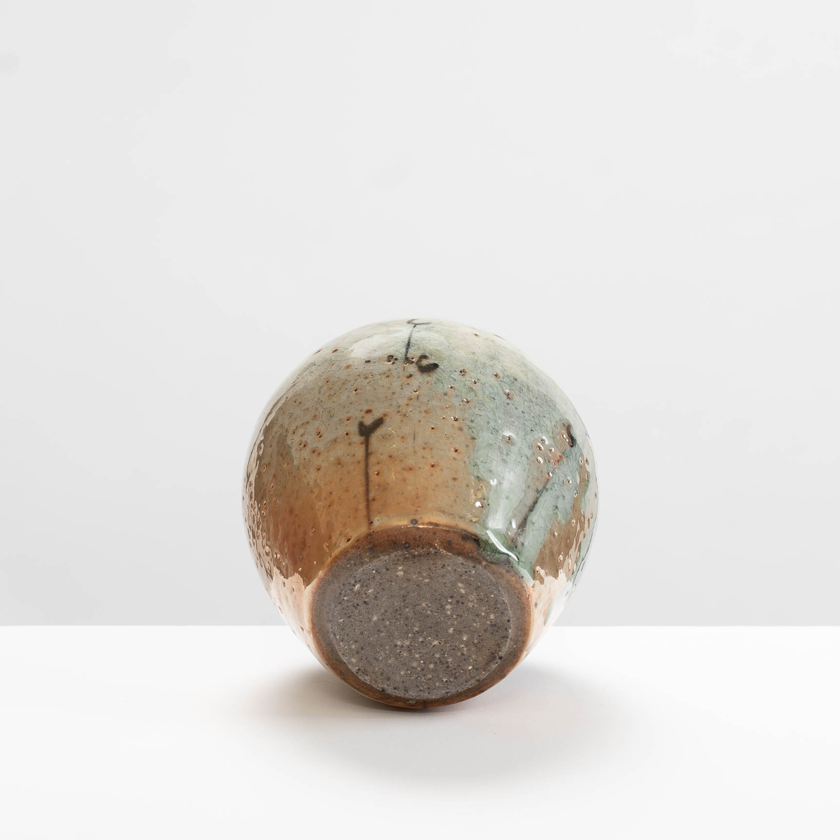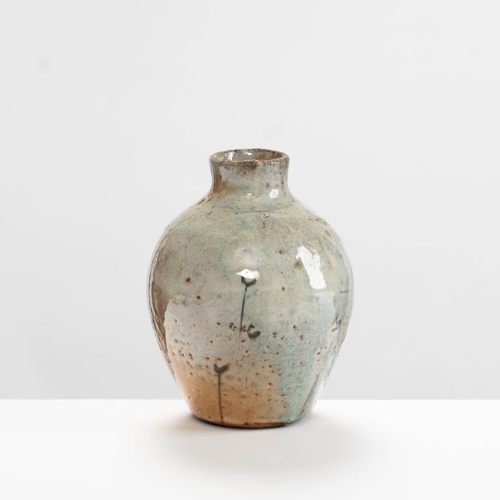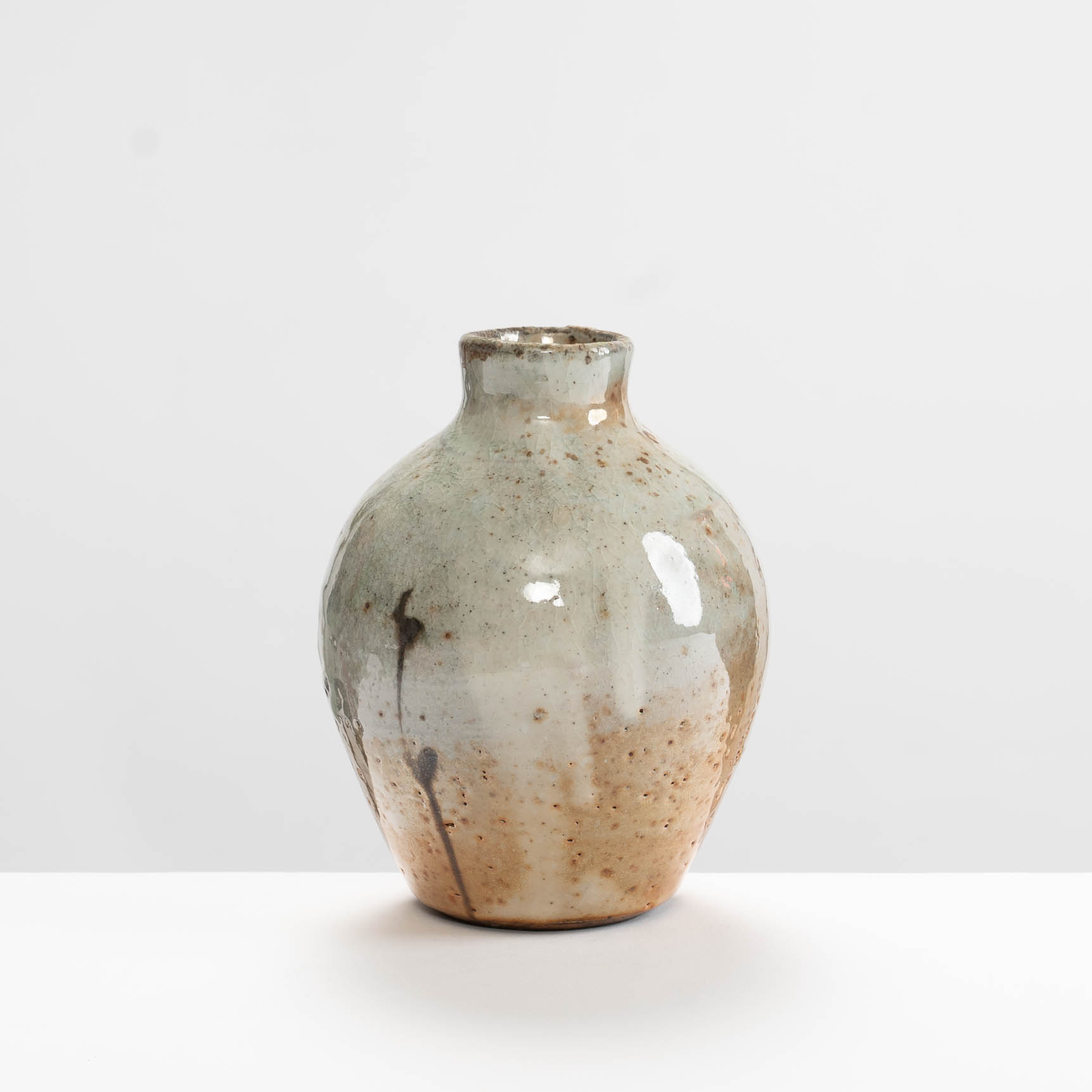 This bottle is wheel-thrown in stoneware clay. It is decorated with slips and a shino glaze, then wood-fired.