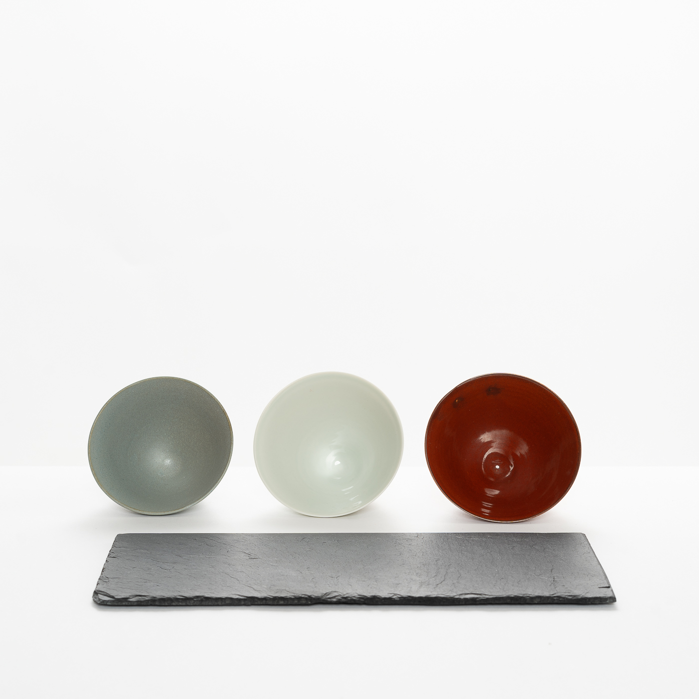 This set of three bowls is wheel-thrown in porcelain. Inspired by the classical porcelain of China and Japan, they are decorated with blue-grey, pale celadon and burnt red glazes. The dishes stand on a slate base.