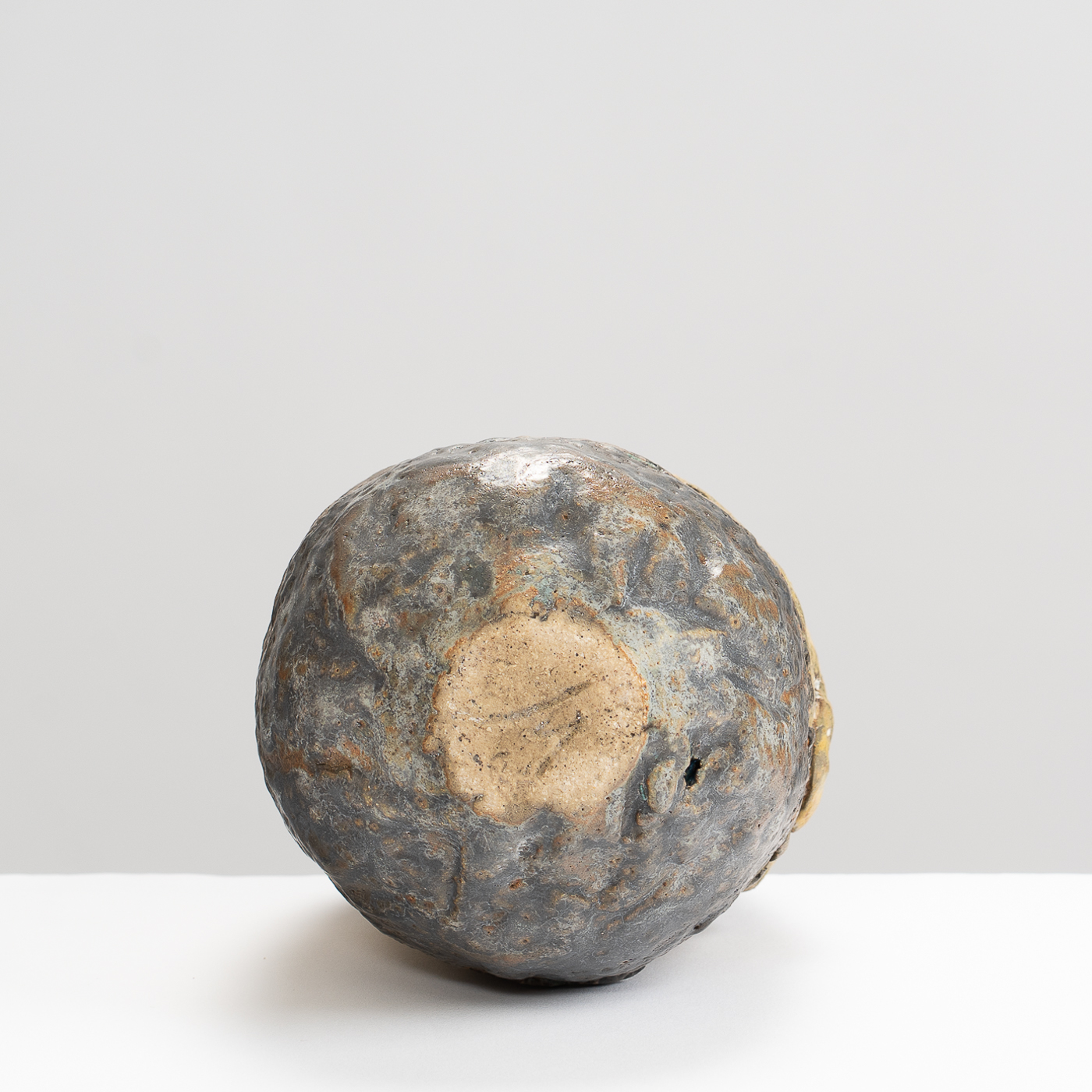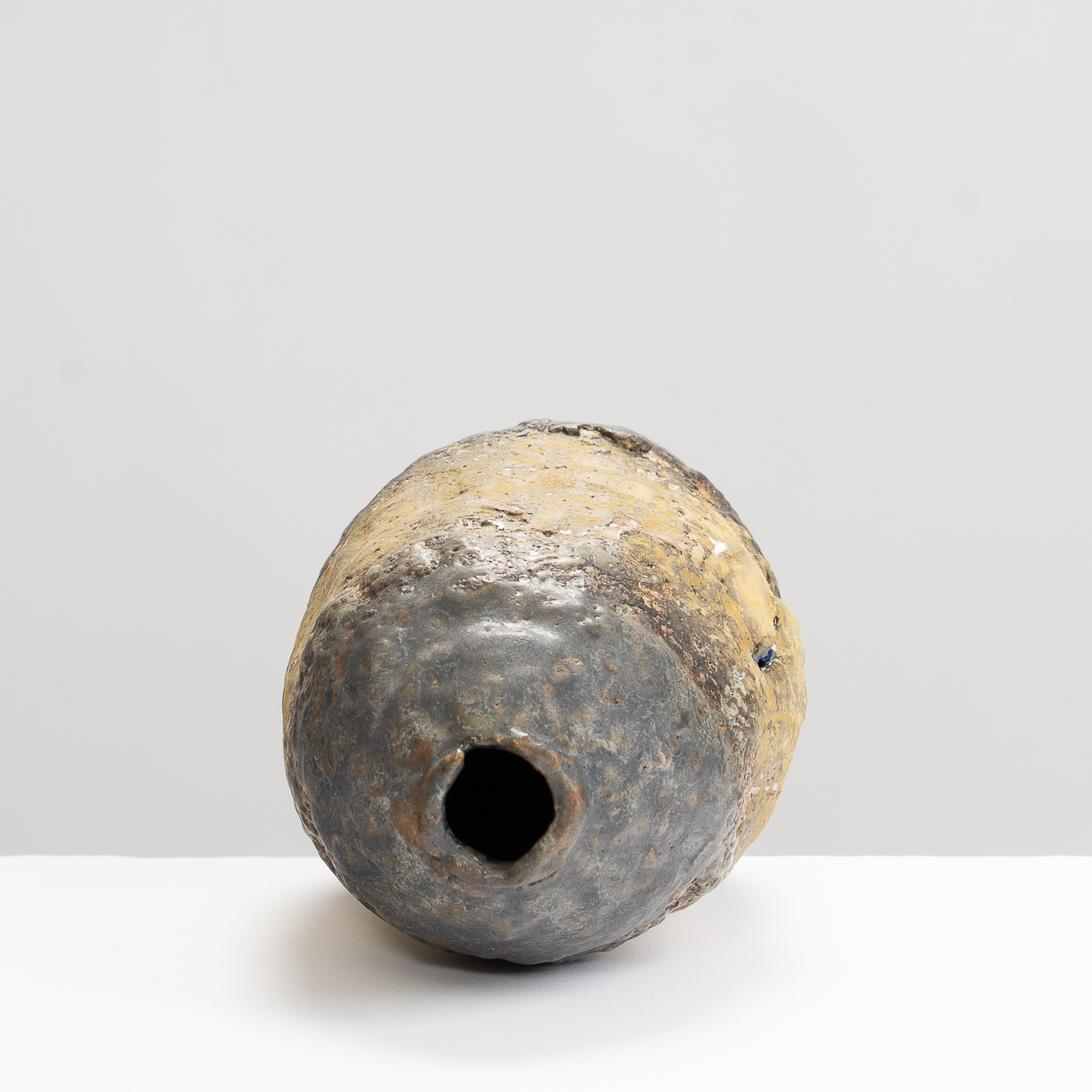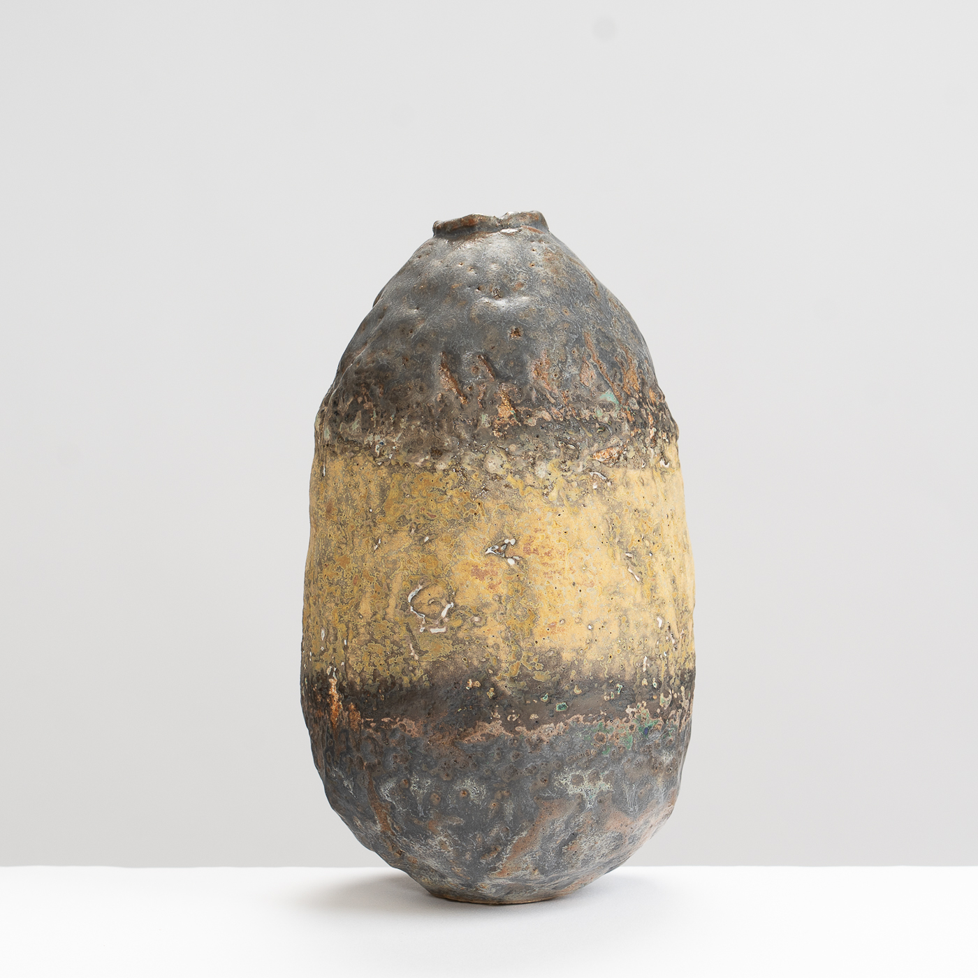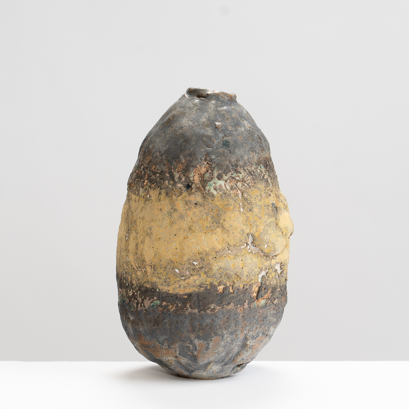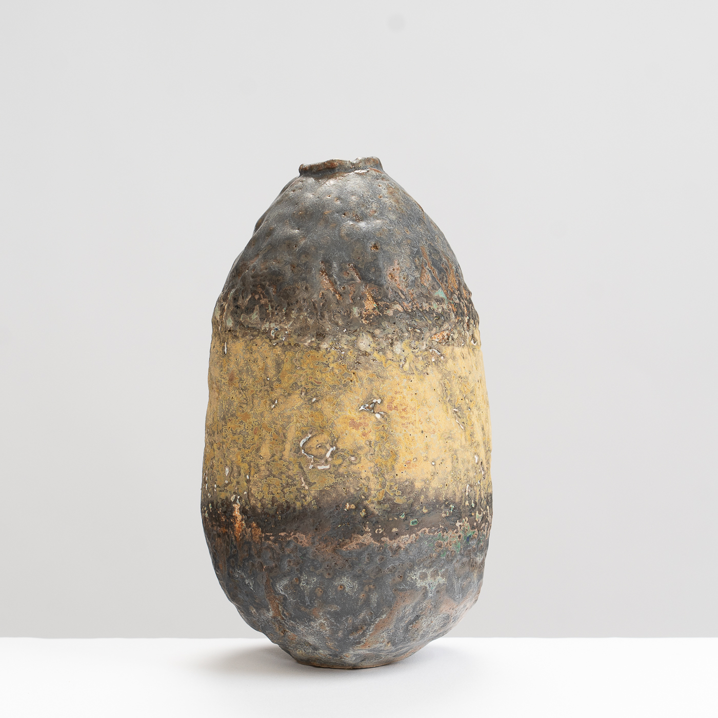 This stoneware vessel is pinched and coiled, and features fingerprints. Layers of slip, oxides and glaze are applied to aid the evocation of the wild and rugged environment of the Australian bush.