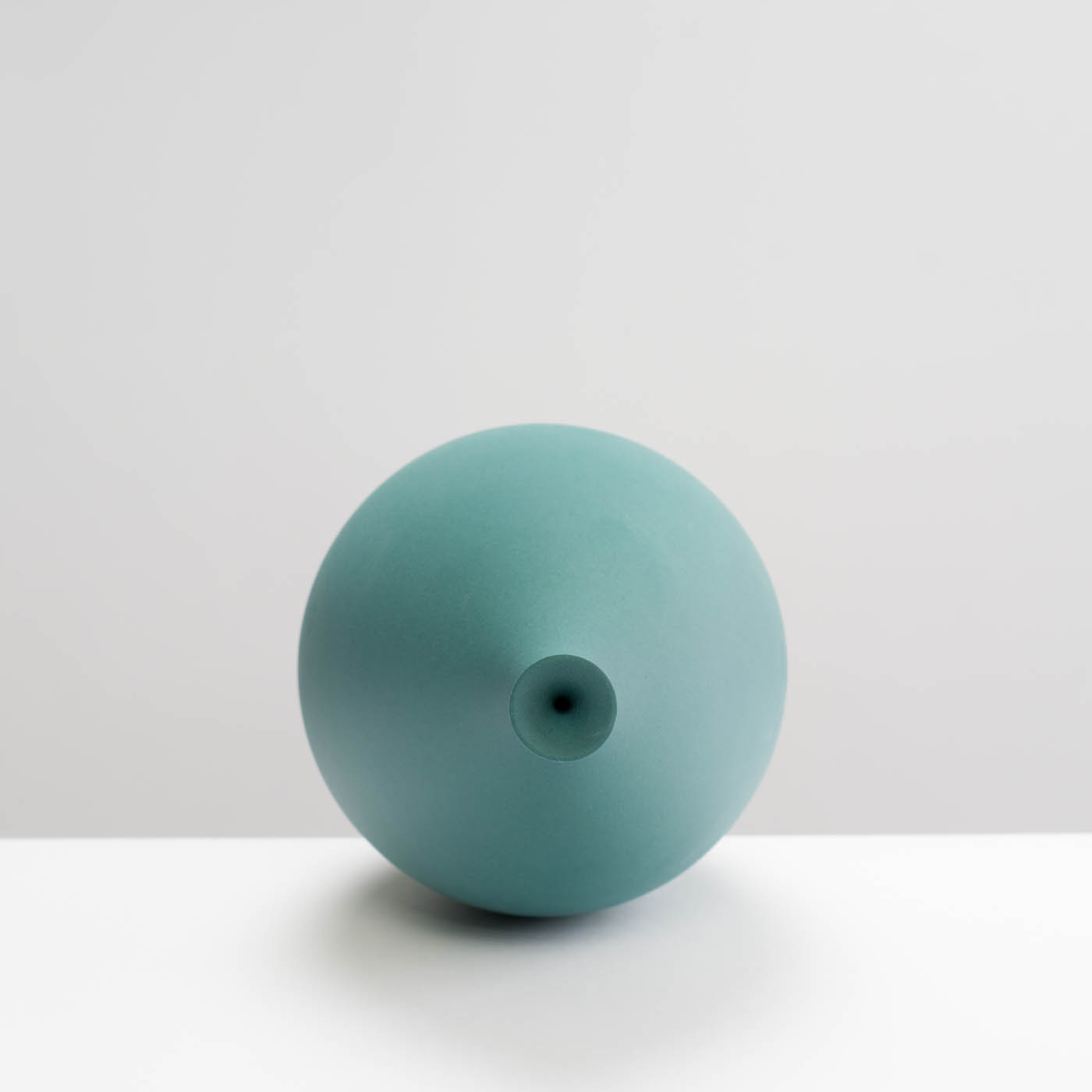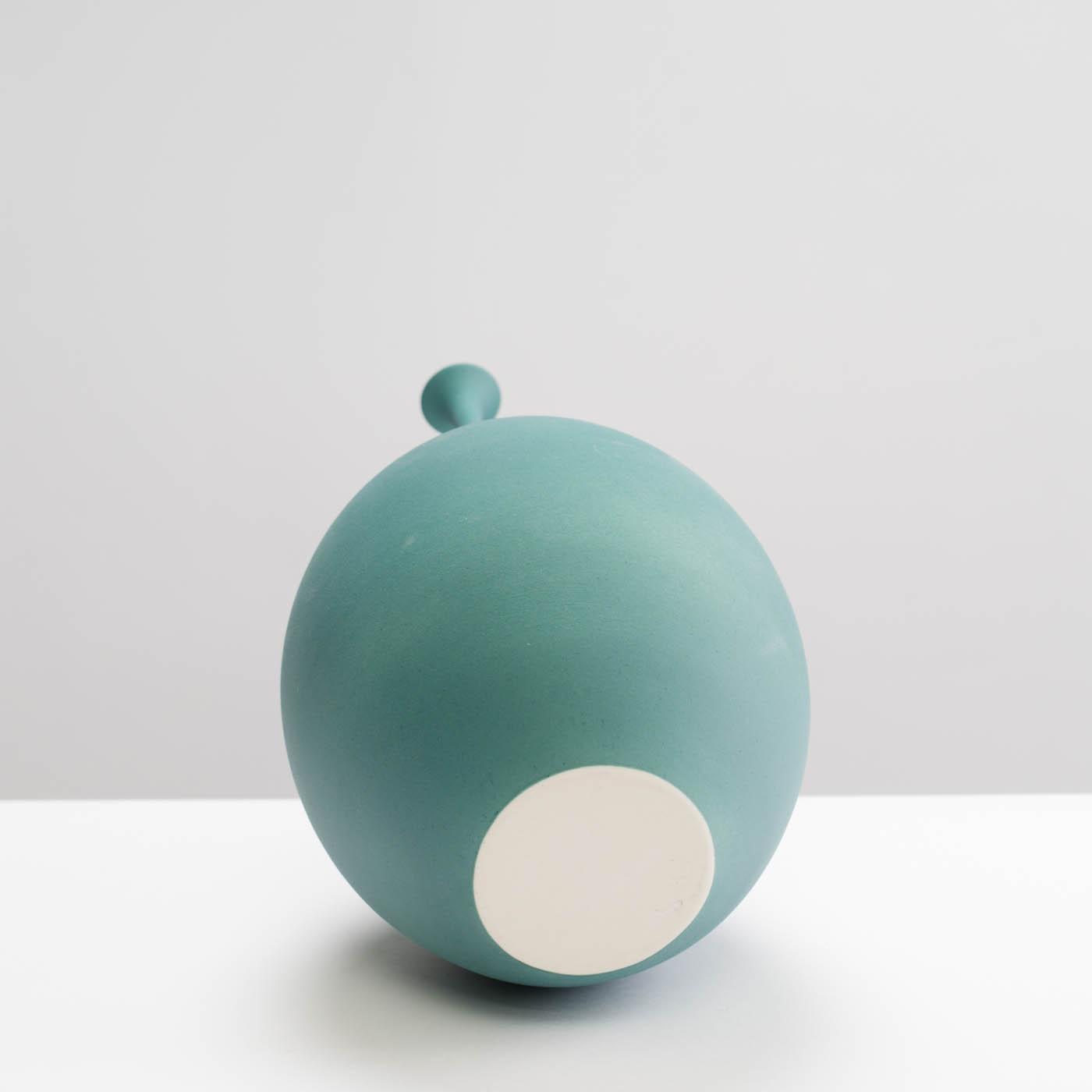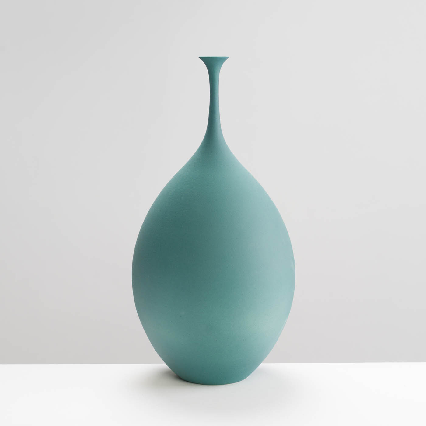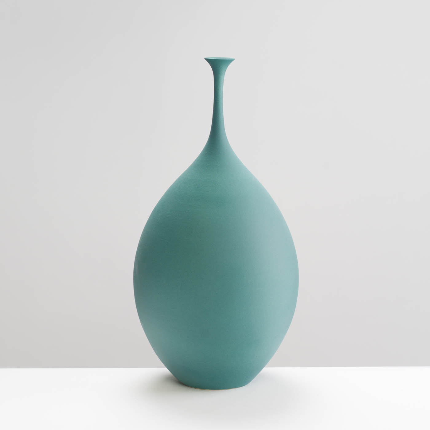 This elegant porcelain pod form is wheel-thrown with precision and enveloped in a dry teal glaze.