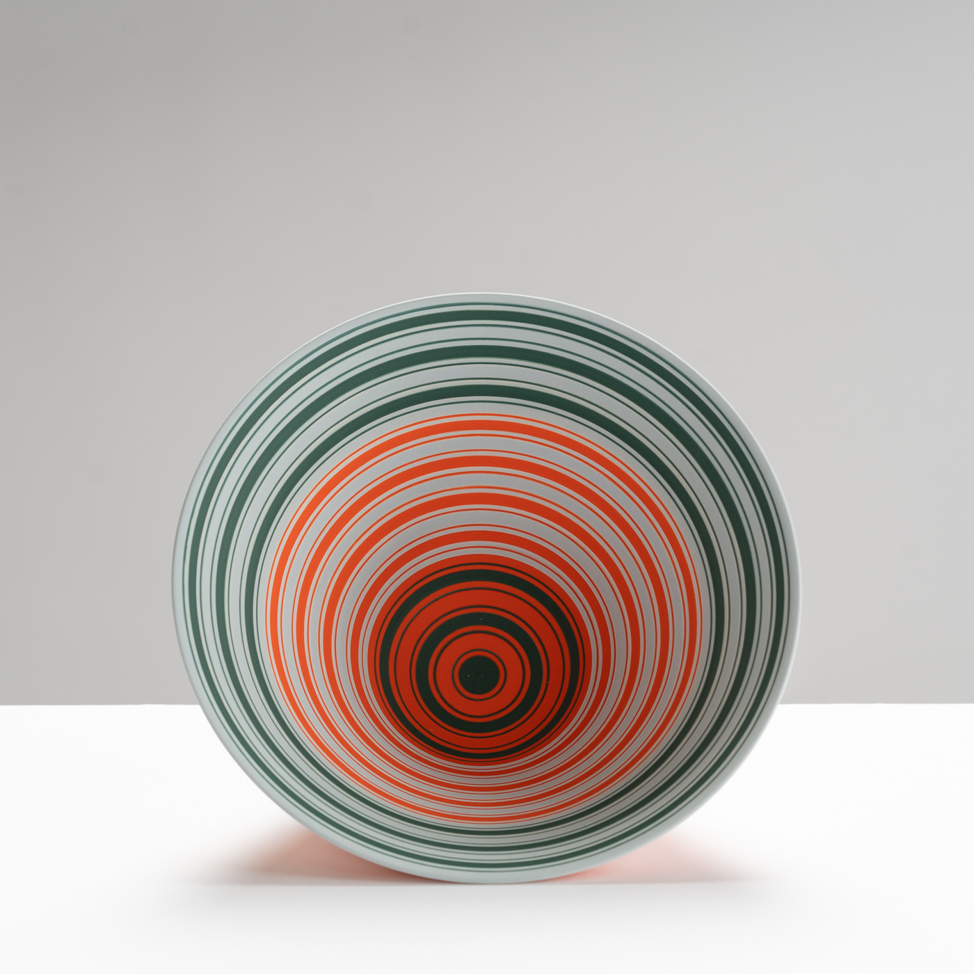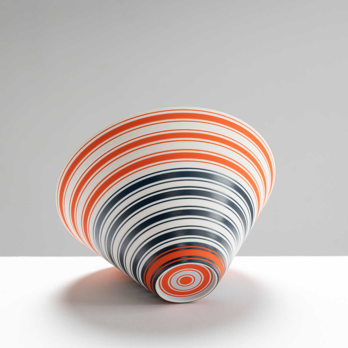 This striking banded bowl is wheel-thrown in porcelain. The coloured stripes enhance the form and create optical intensity.