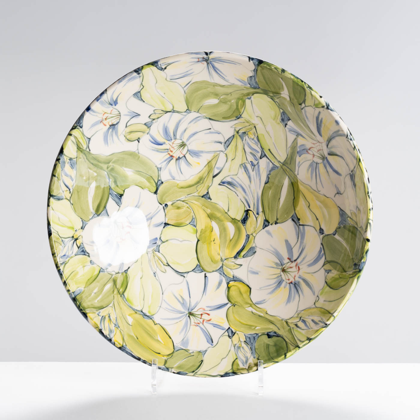This earthenware bowl is wheel-thrown in fine white earthenware clay. The surface is lightly burnished to create a smooth surface for the colourful underglaze decoration which is painted freely onto the surface. The piece is finished in a transparent glaze.