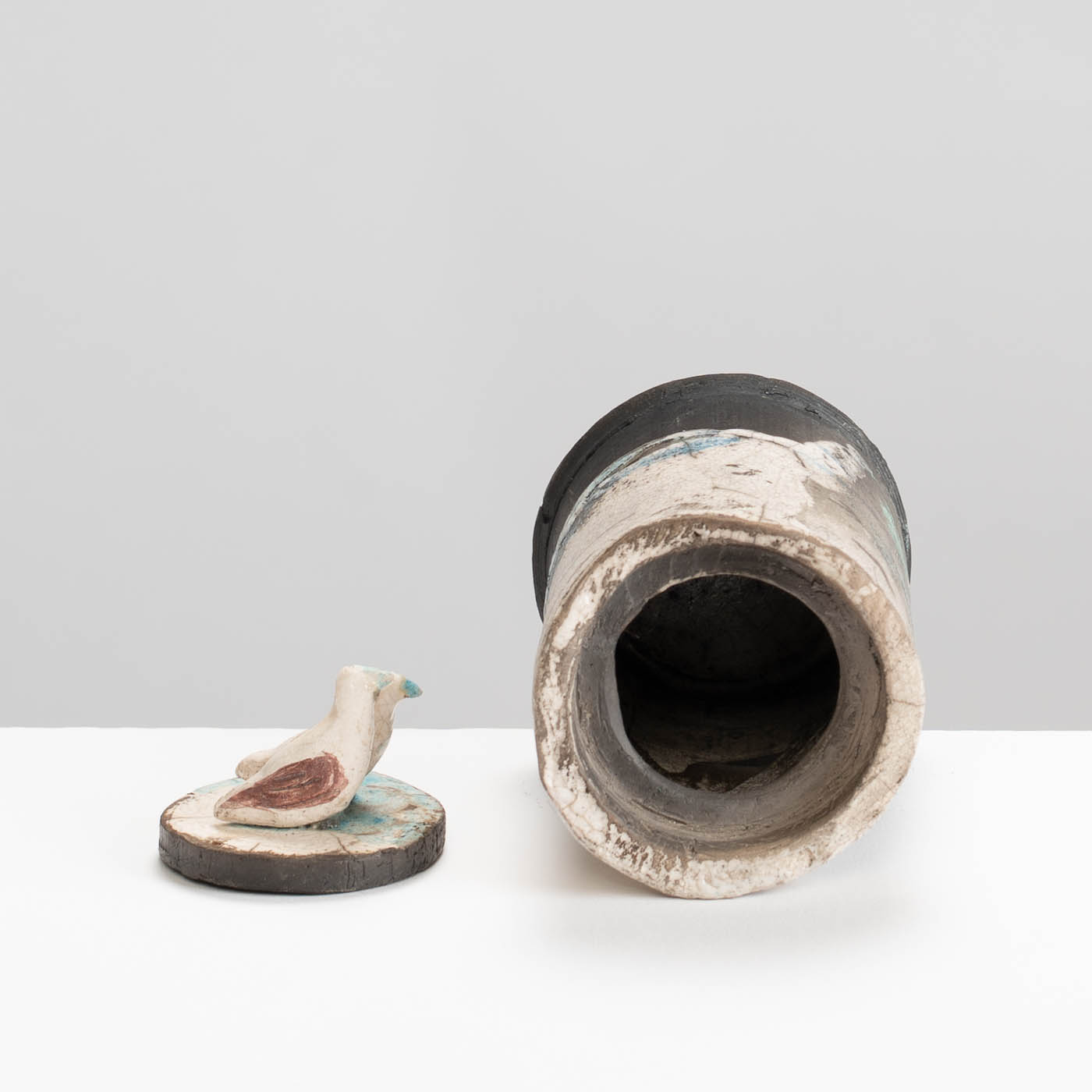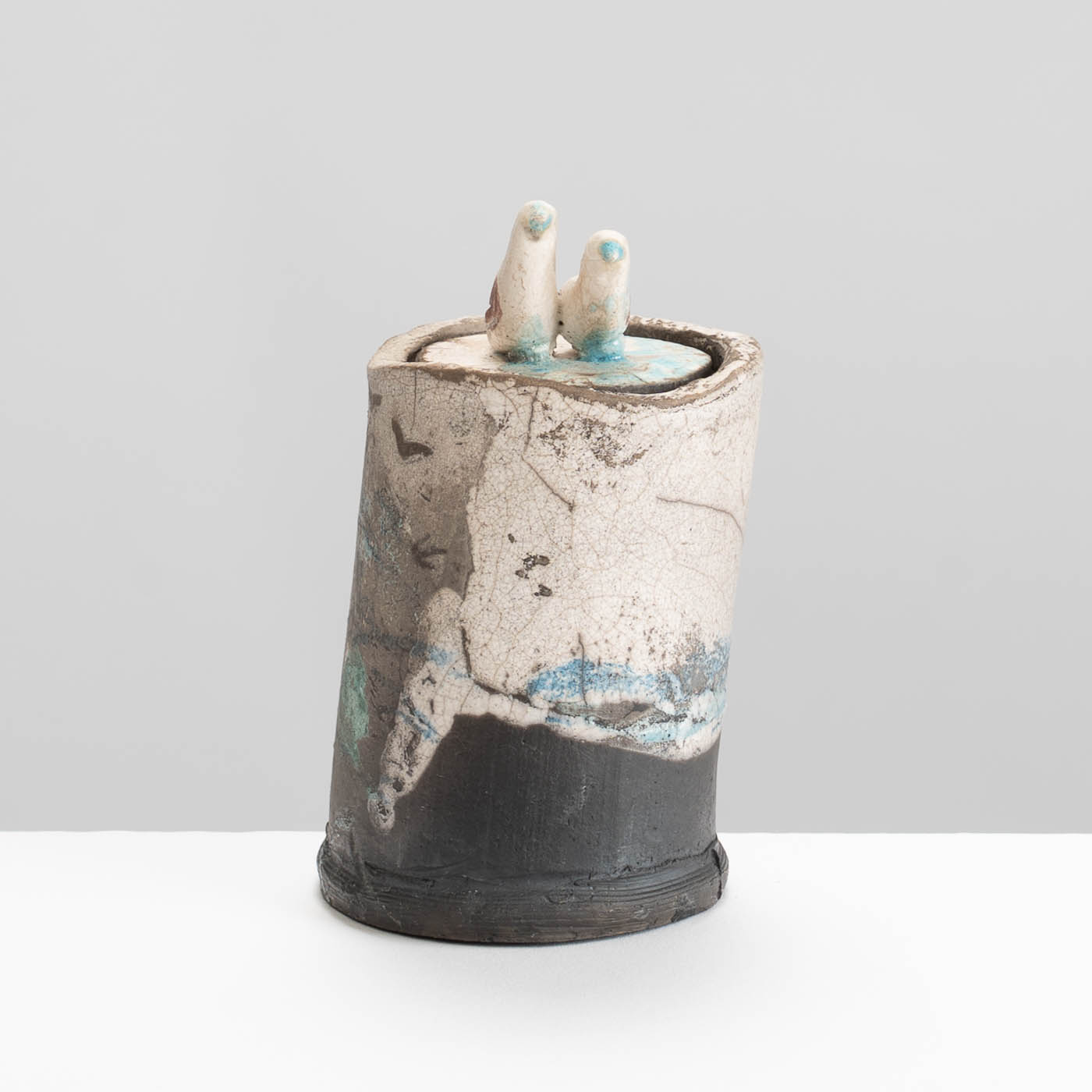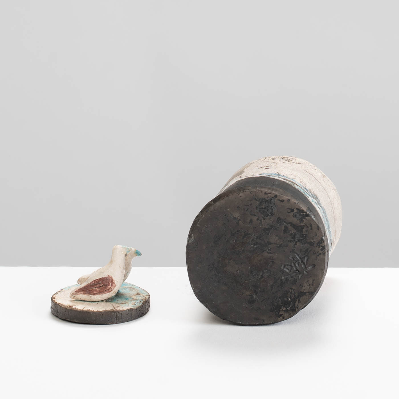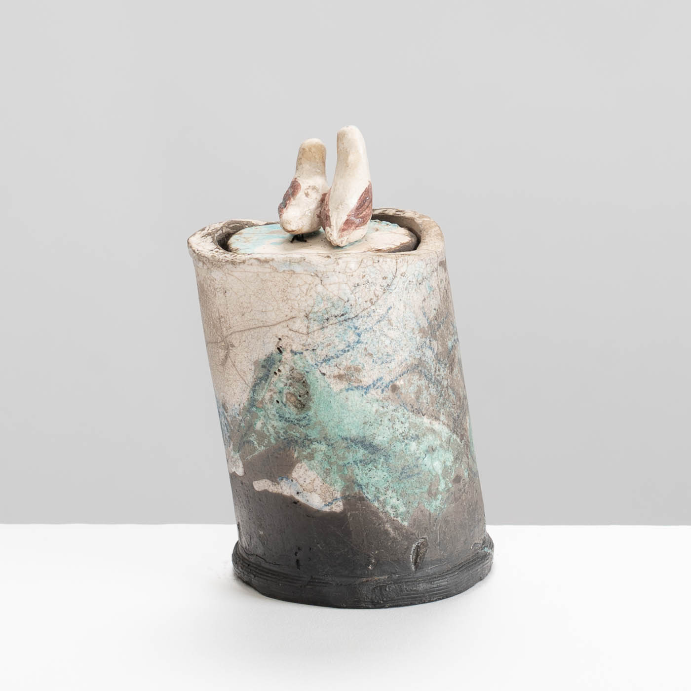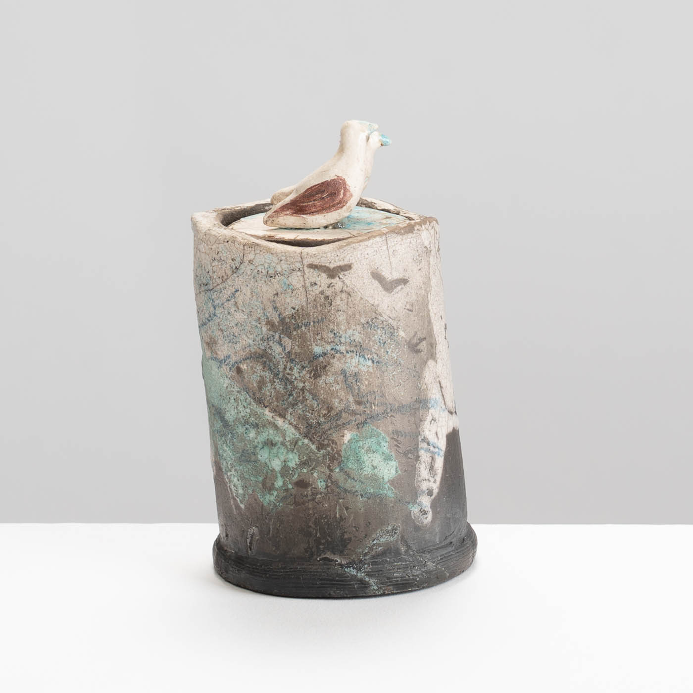 Message Box is Hiro’s response to the impact of environmental catastrophes on birds and animals. She attempts to give voice to these innocent victims through these objects. A space is made for a message or wish for connection with each other and the spirit of nature. This raku-fired lidded box is hand-built, and features a representation of an animal or bird in their natural habitat.
