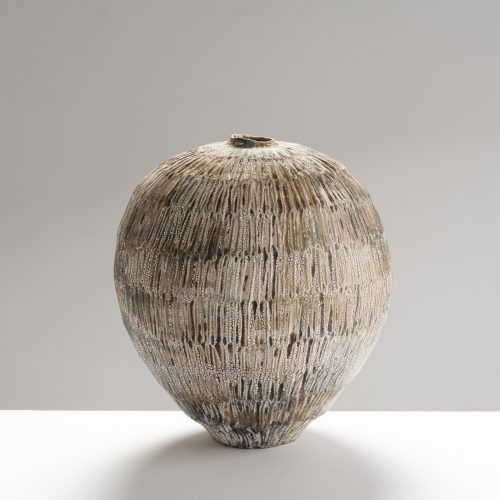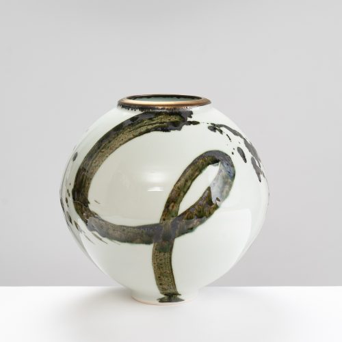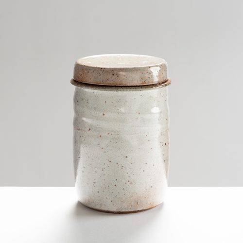 This reduction fired stoneware jar is thrown on a momentum kick wheel and features a ringed pattern and splashes. Tarragon collects and works with local clays and local ash, and decorates in an immediate way with simple oxides and glazes, often with motifs of waves, water, and the sea.