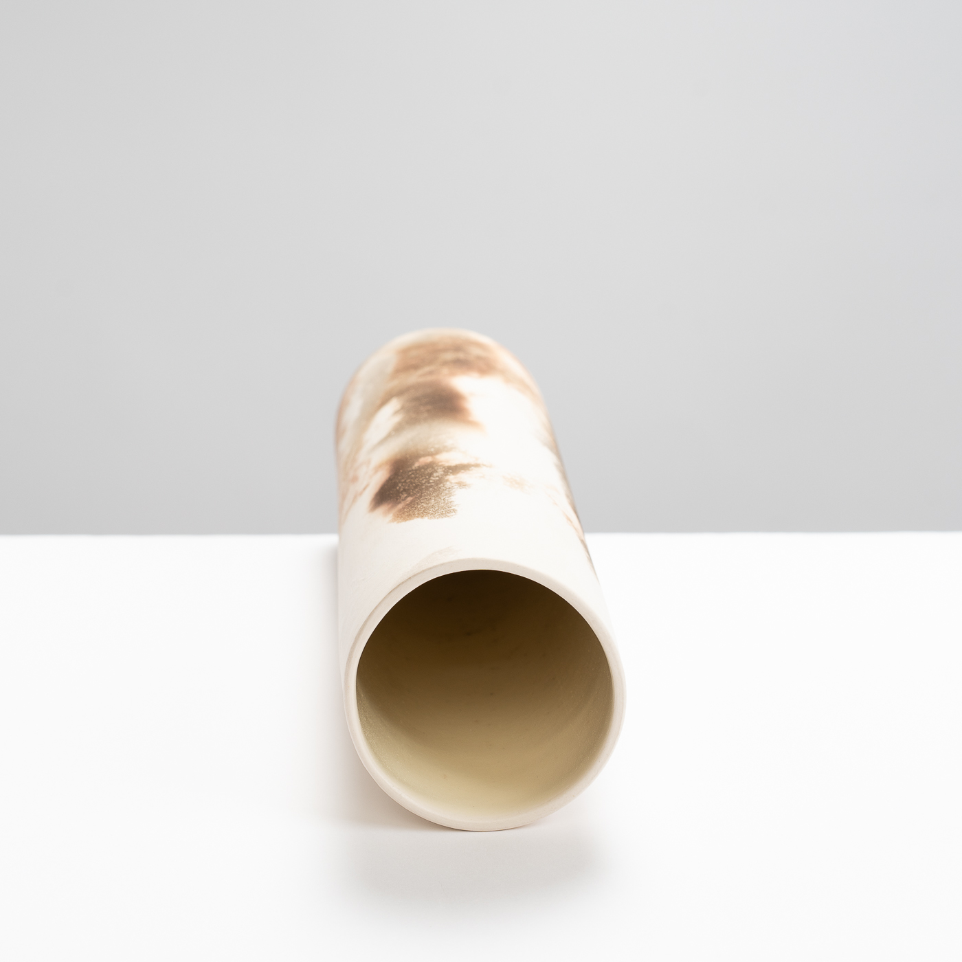 This earthenware is vase slip-cast. It is unusually both smoke-fired, yet able to hold water. This is achieved with a combination of strong brush strokes and finely sprayed slip, finished by smoke firing the high fired surface.