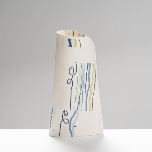 A hand-built double walled vessel constructed using a combination of slabbing, press moulding & coiling. The clay is a mixture of porcelain and stoneware – mixed with organic or manmade material which fires out creating a pitted surface. The piece is burnished, then low bisque fired, refined with sandpaper and low fired again, inlaid with a mixture of lime and oxide, placed in a saggar and undergoes a final smoke firing.