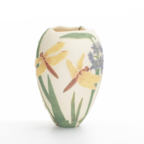 Layers of decorative slips are applied in a painterly manner to build up the surface and create a depth that holds similarities to misty skies in this beautiful vessel.