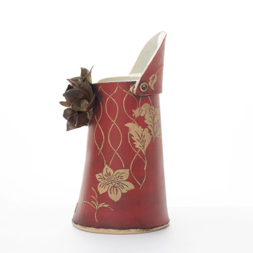 This earthenware jug exemplifies Walter’s passion for design and imaginative creativity. Its curved, extruded form is adorned with sprigged thorns and finished with fluid, expressive glazes.