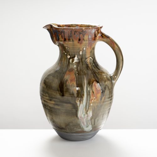 This jug exemplifies Walter’s passion for design and imaginative creativity. Its curved, extruded form is adorned with sprigs, and features a characteristic orange peel texture, produced through the salt glaze firing