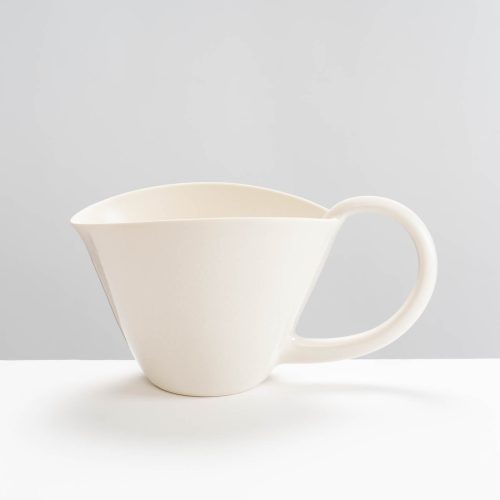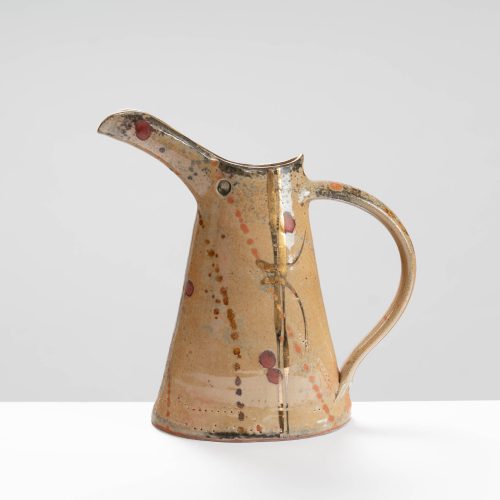 This pourer exemplifies Walter’s passion for design and imaginative creativity. Its curved, extruded form is adorned with sprigs, and features a characteristic orange peel texture, produced through the salt glaze firing process.