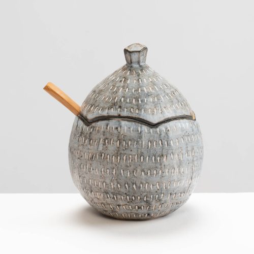 This stoneware jug is wheel-thrown. Its slate-like surface is created by sgraffito on an indigo slip which is then enveloped in a white glaze. Yo’s work is inspired by Japanese folk indigo textiles,16–17th century Nezumi Shino ware, and the beautiful surroundings of rural Dorset.