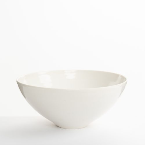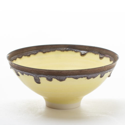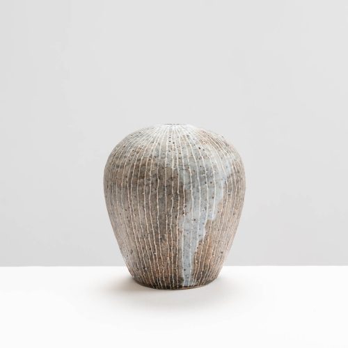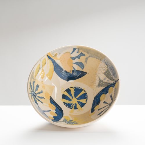 This stoneware bowl is wheel-thrown. Its slate-like surface is created by sgraffito on an indigo slip which is then enveloped in a white glaze. Yo’s work is inspired by Japanese folk indigo textiles,16–17th century Nezumi Shino ware, and the beautiful surroundings of rural Dorset.
