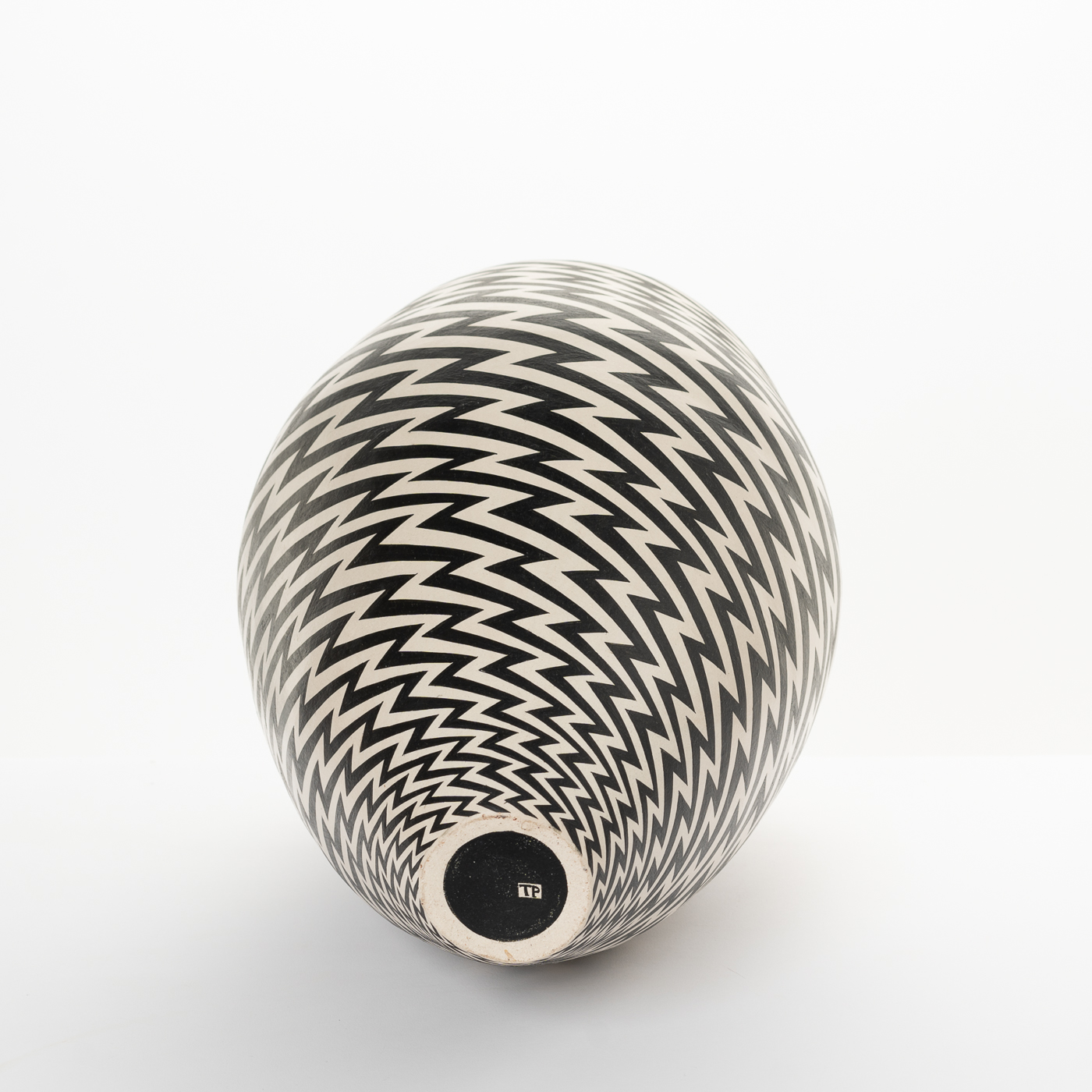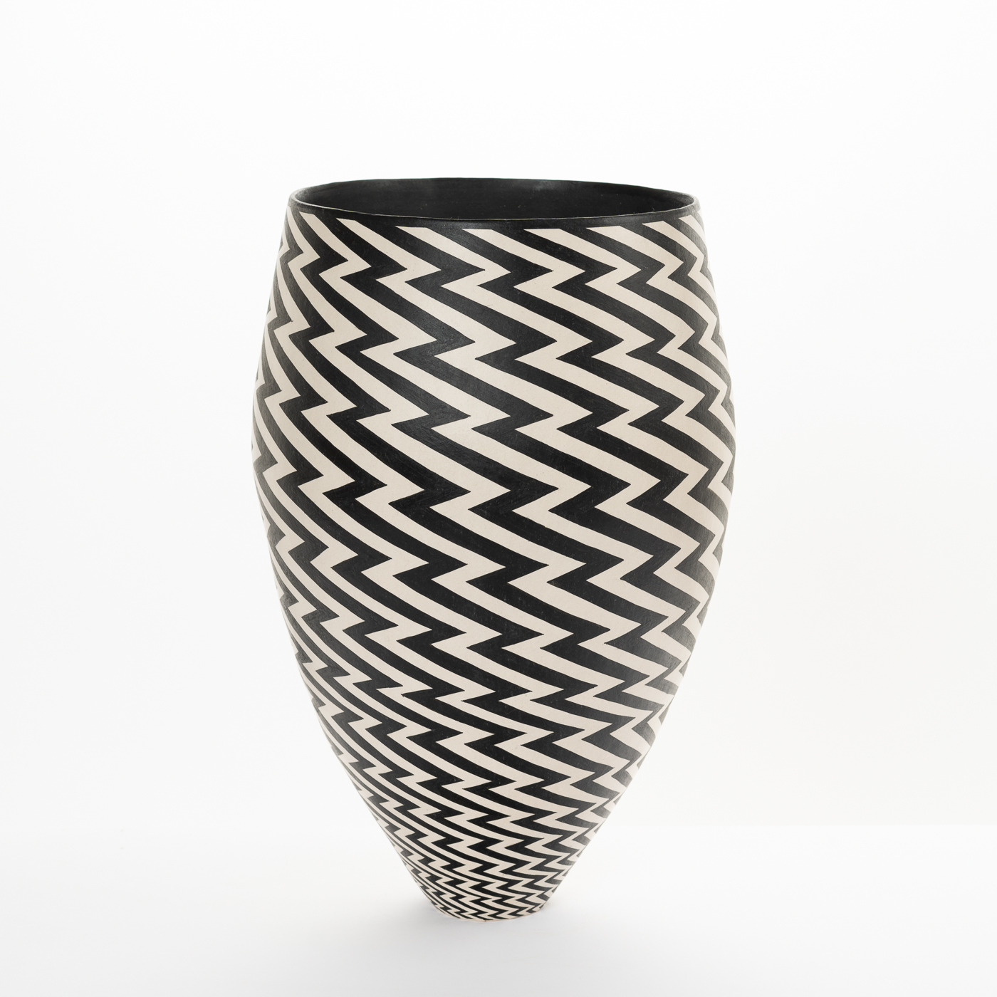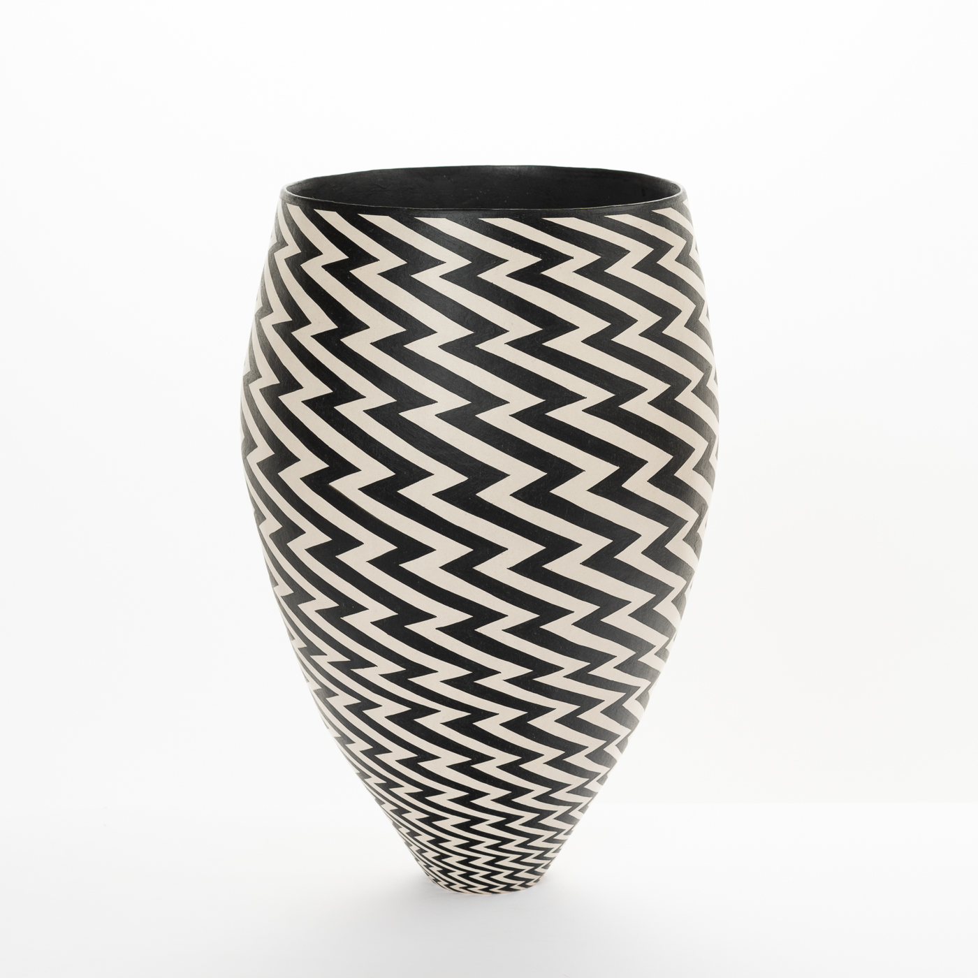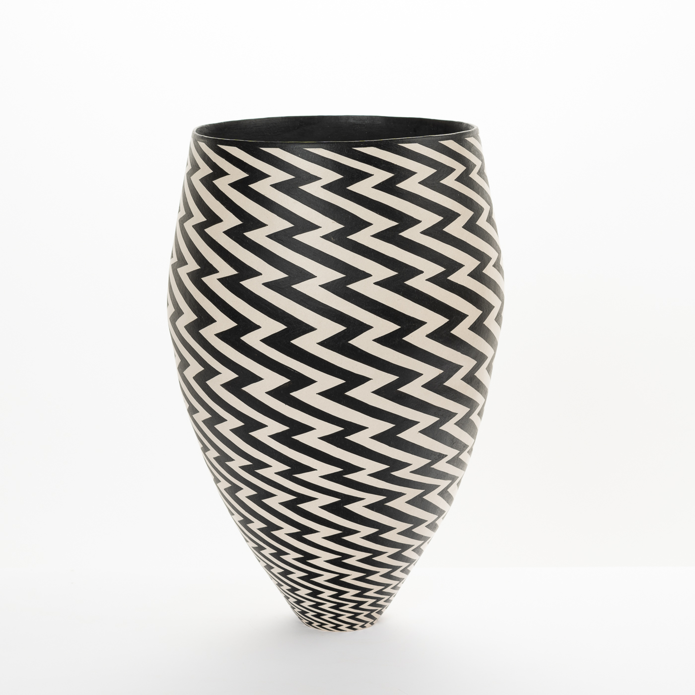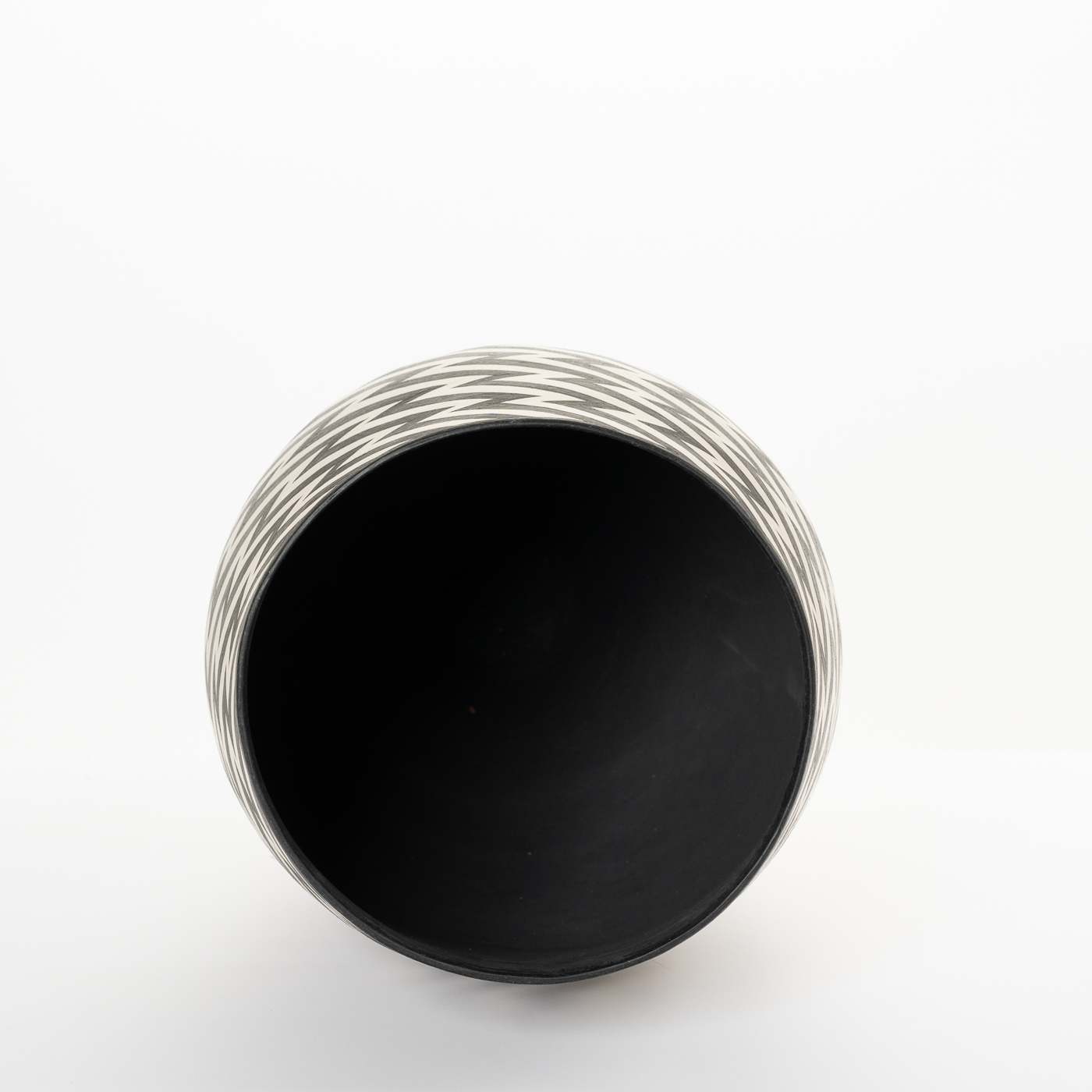 This striking monochrome vessel is hand-built and decorated with several layers of slip. This is then burnished and an intricate black geometric design is meticulously hand painted. The vessel is unglazed but sealed and polished and has a naturally matt surface.
