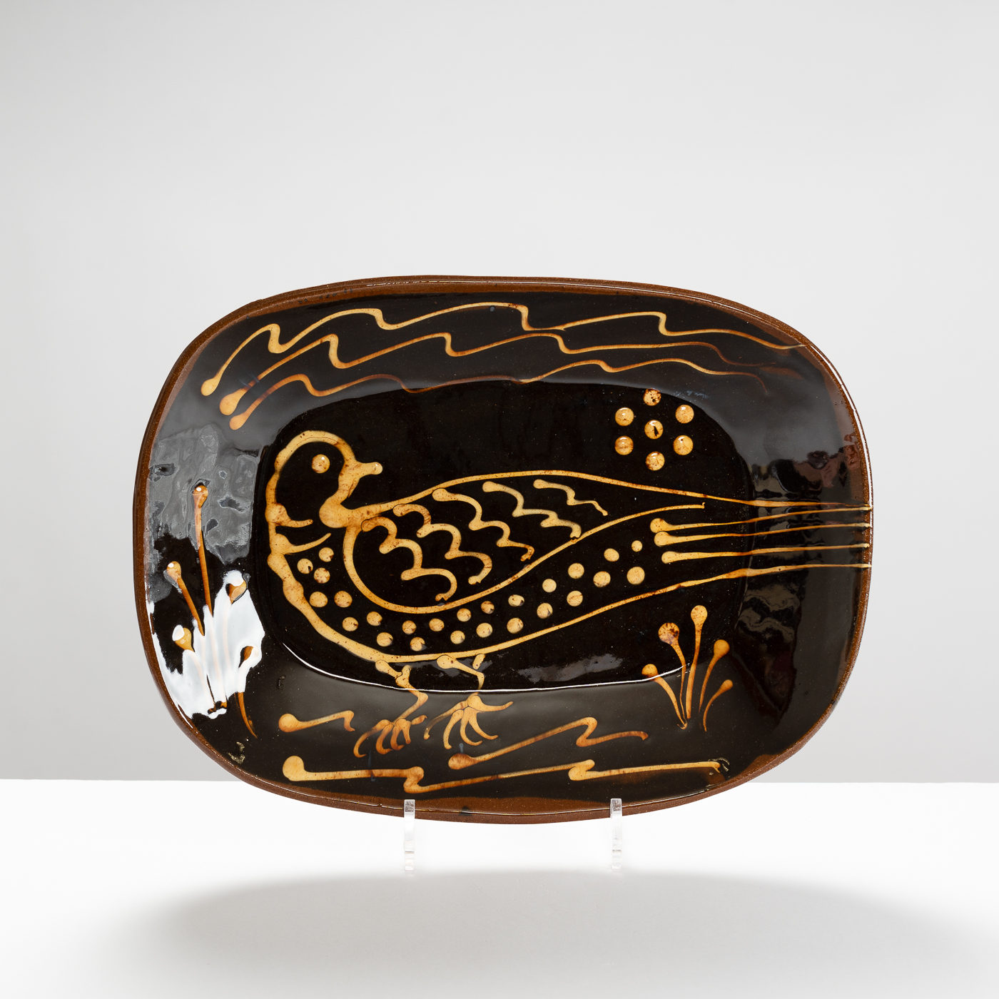 Doug works in red earthenware clay, the pots simply decorated, with appliqué decoration or sgraffito, using a basic palette of traditional slips that are made from natural raw materials. The majority of his pots are thrown on the wheel with some press moulded dishes, decorated with freely trailed lines.