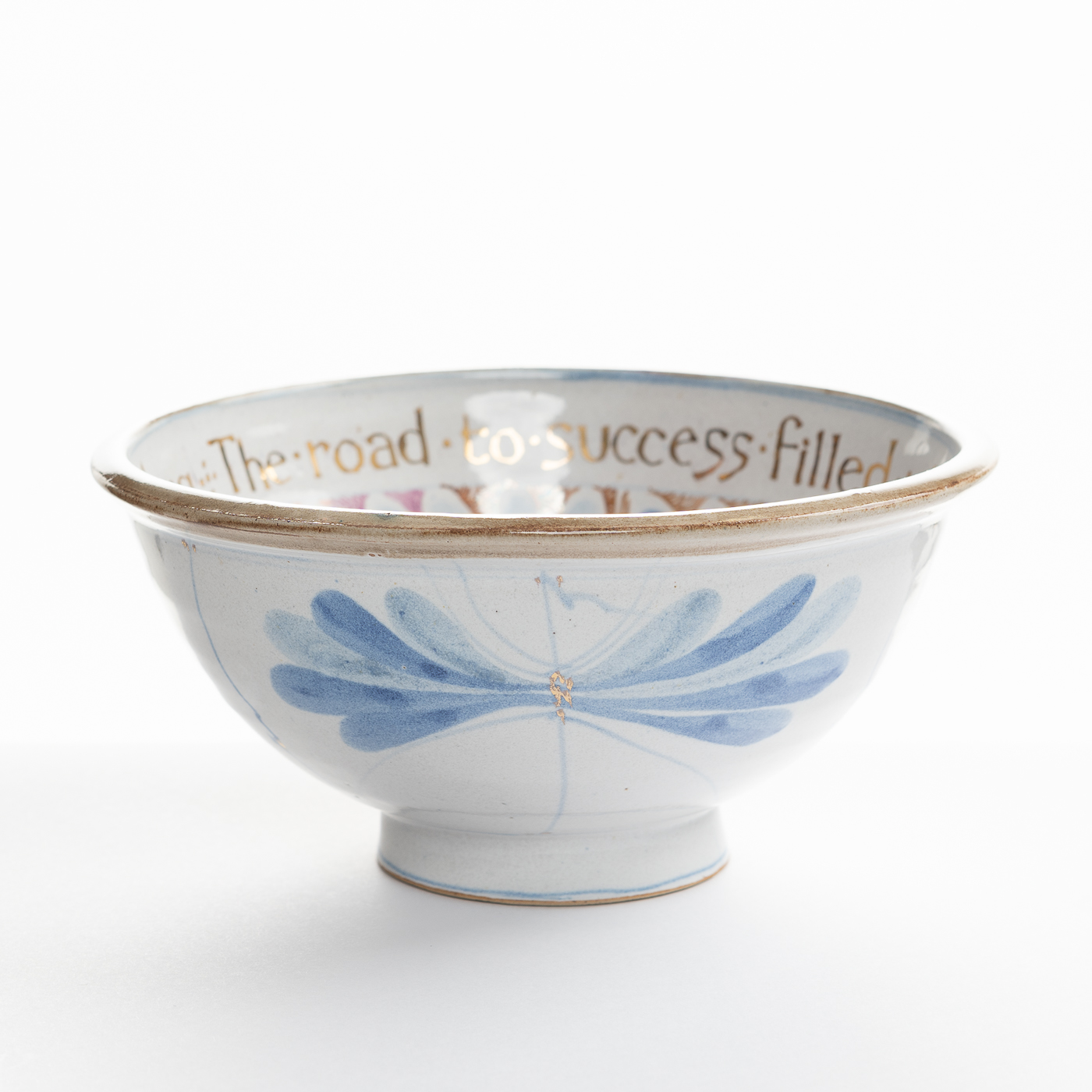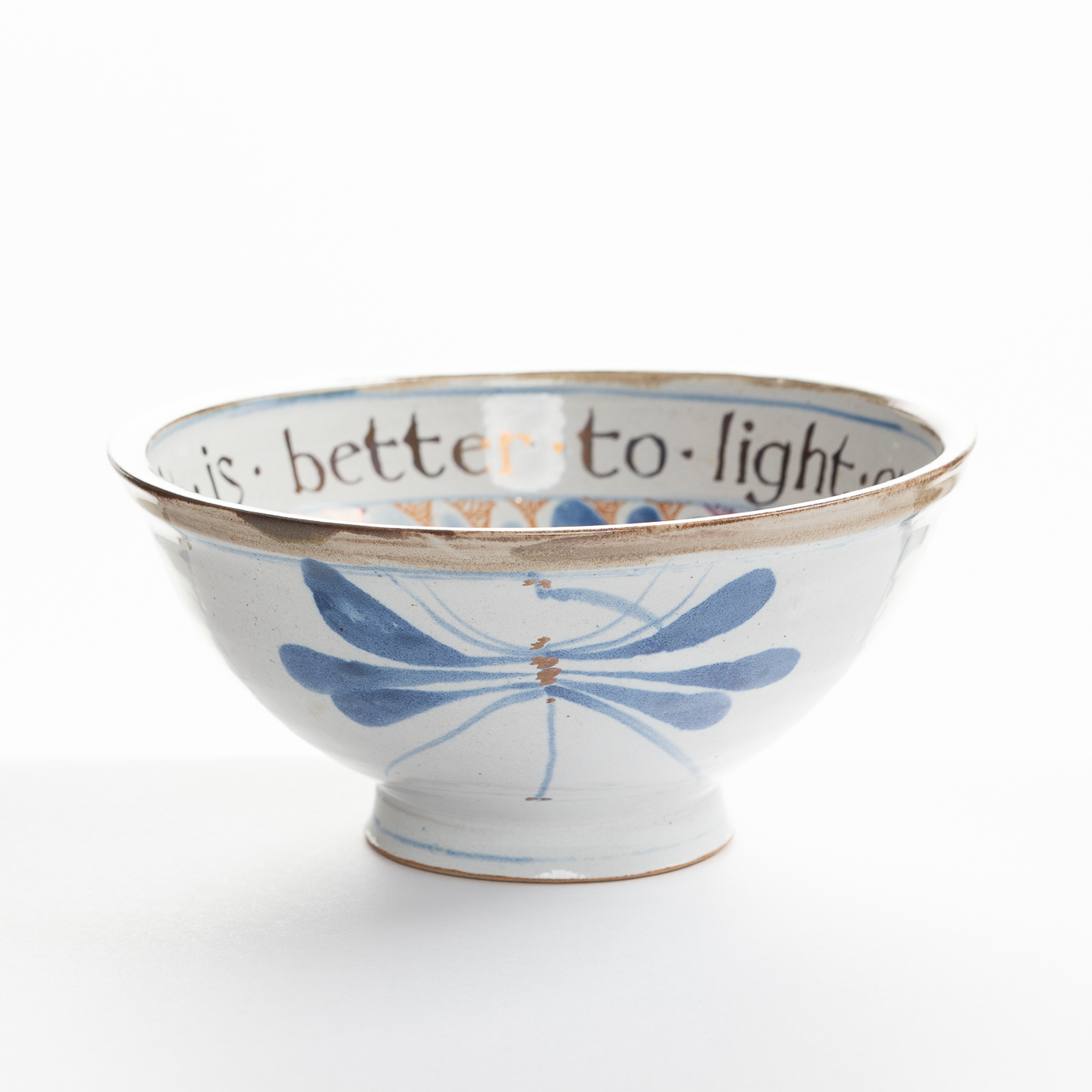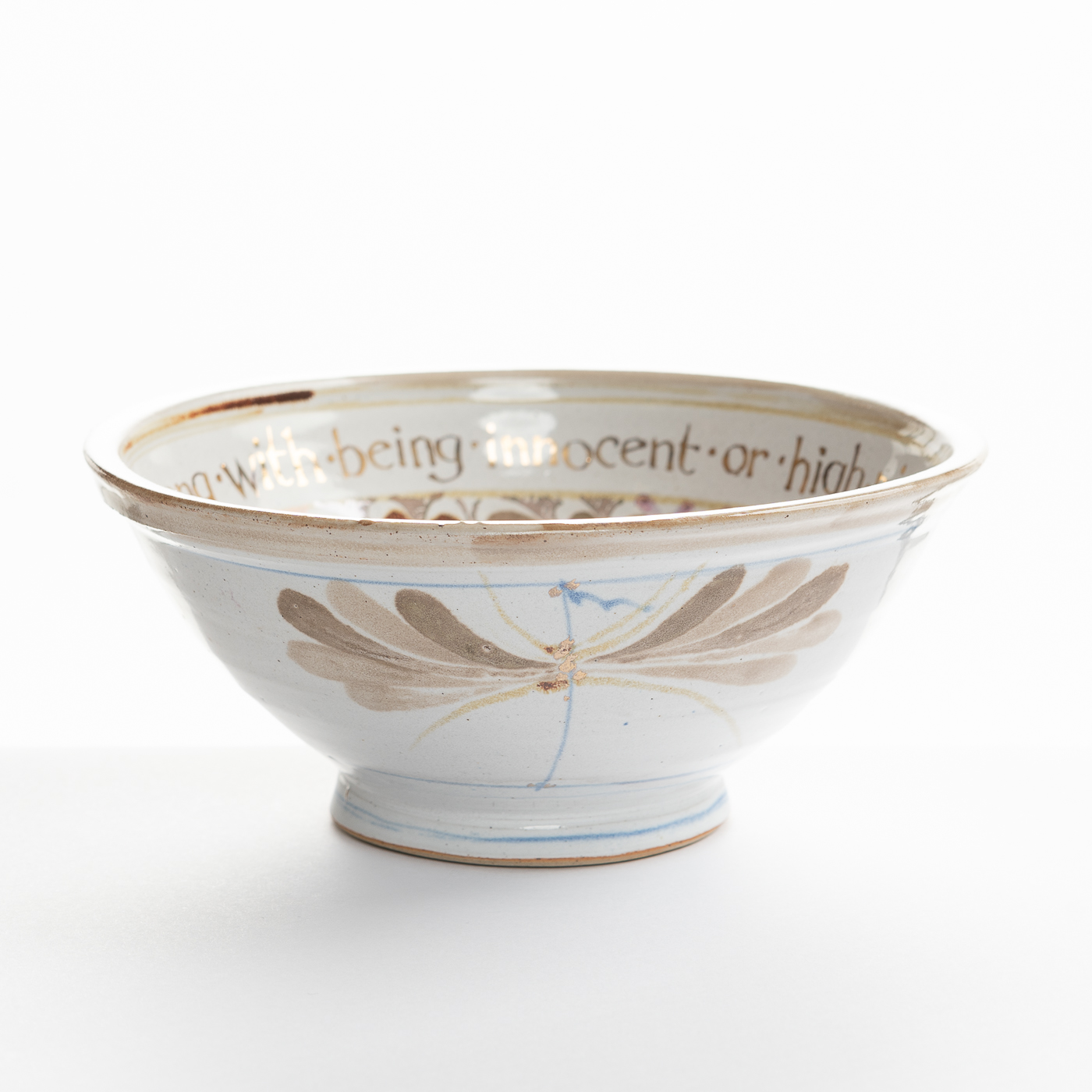 Since 2000 Owen Thorpe has been producing ‘families’ of pots using recurring themes and he has been making bowls and plates with inscriptions. All his work is made using a soft stoneware, high fired with occasional further enamel firings.