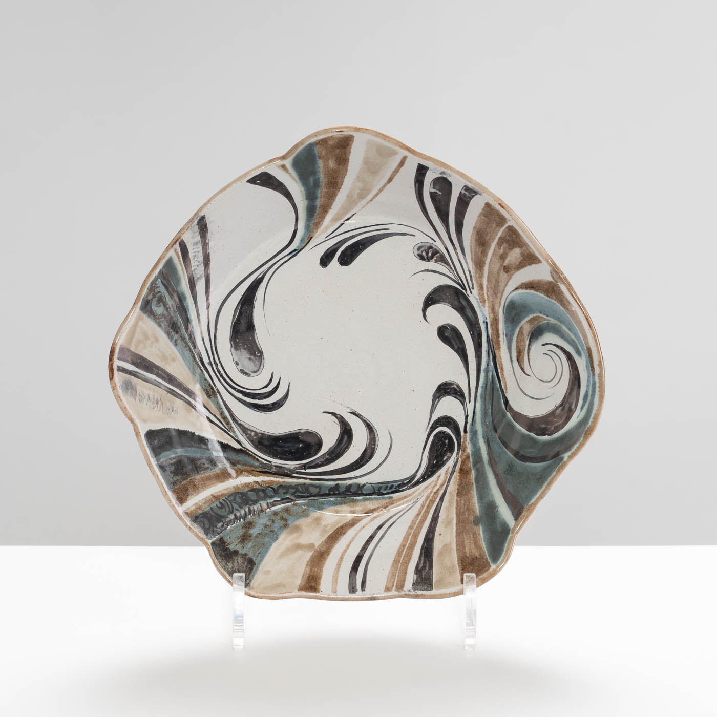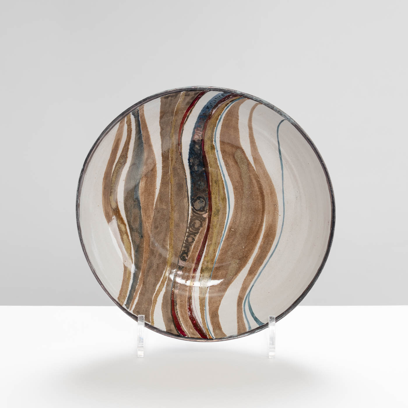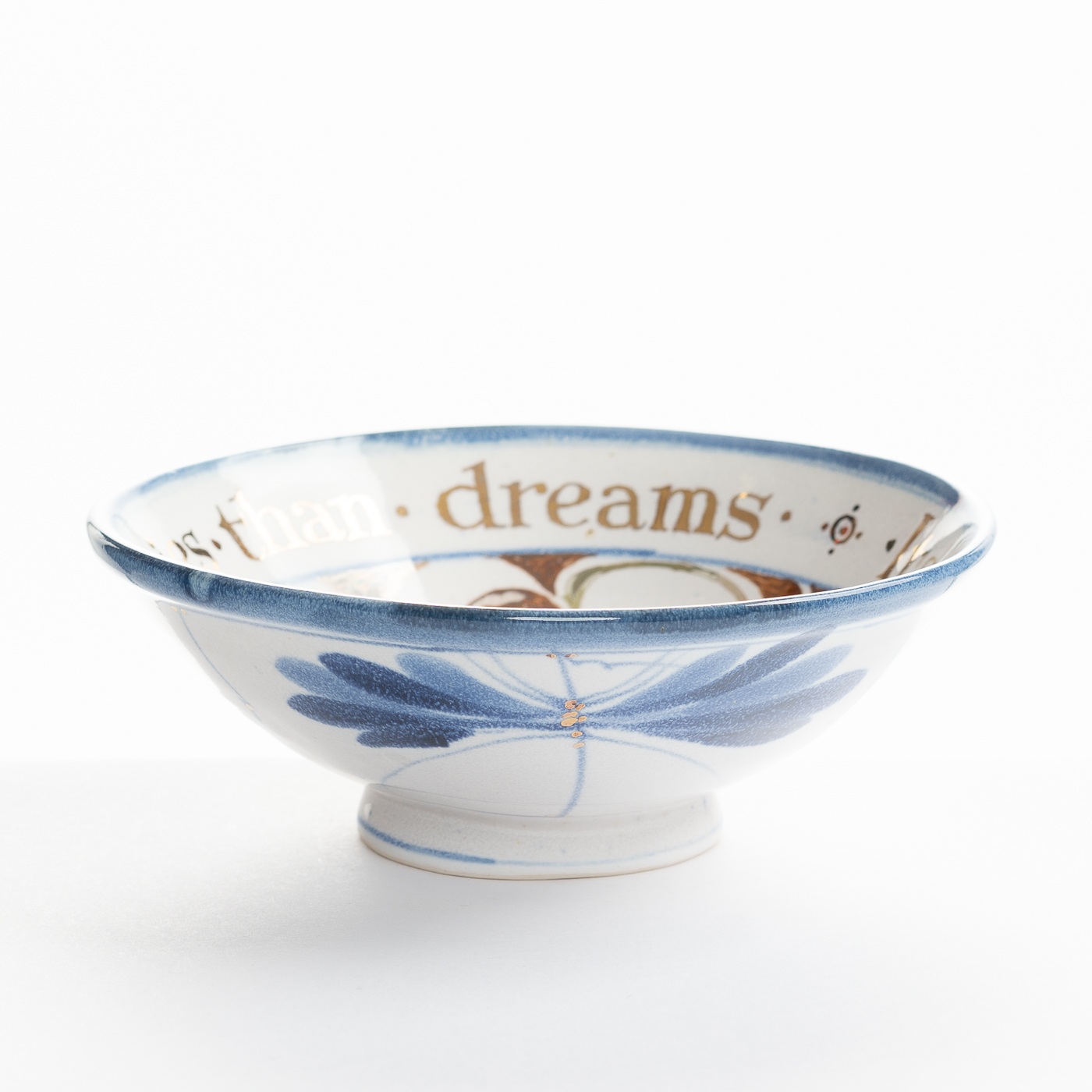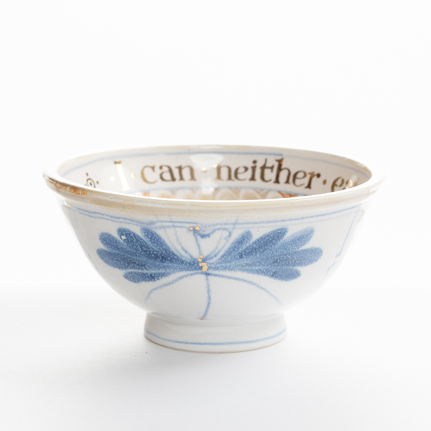 Since 2000 Owen Thorpe has been producing ‘families’ of pots using recurring themes and he has been making bowls and plates with inscriptions. All his work is made using a soft stoneware, high fired with occasional further enamel firings.