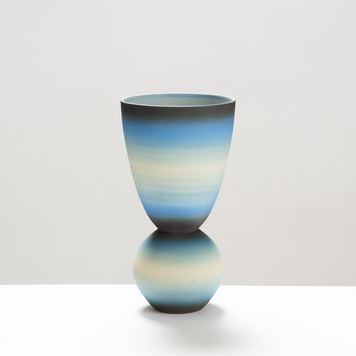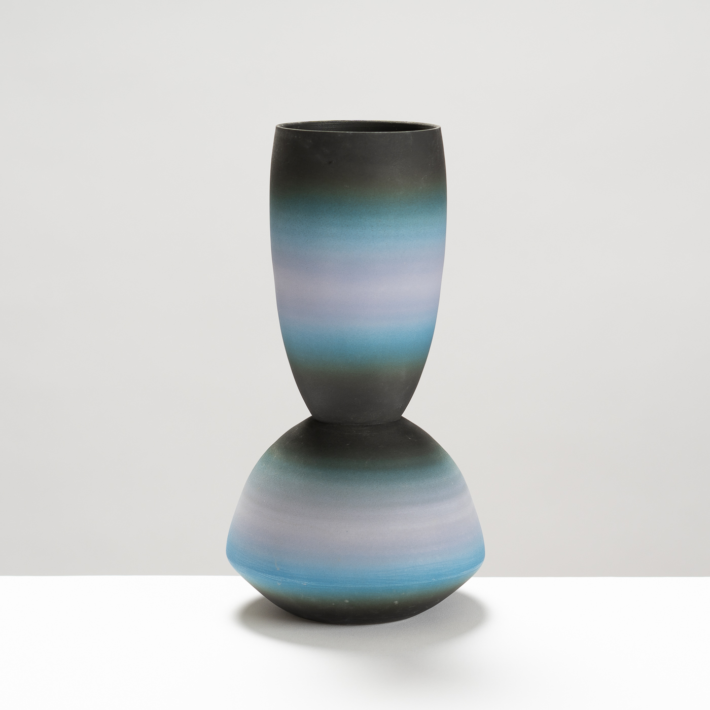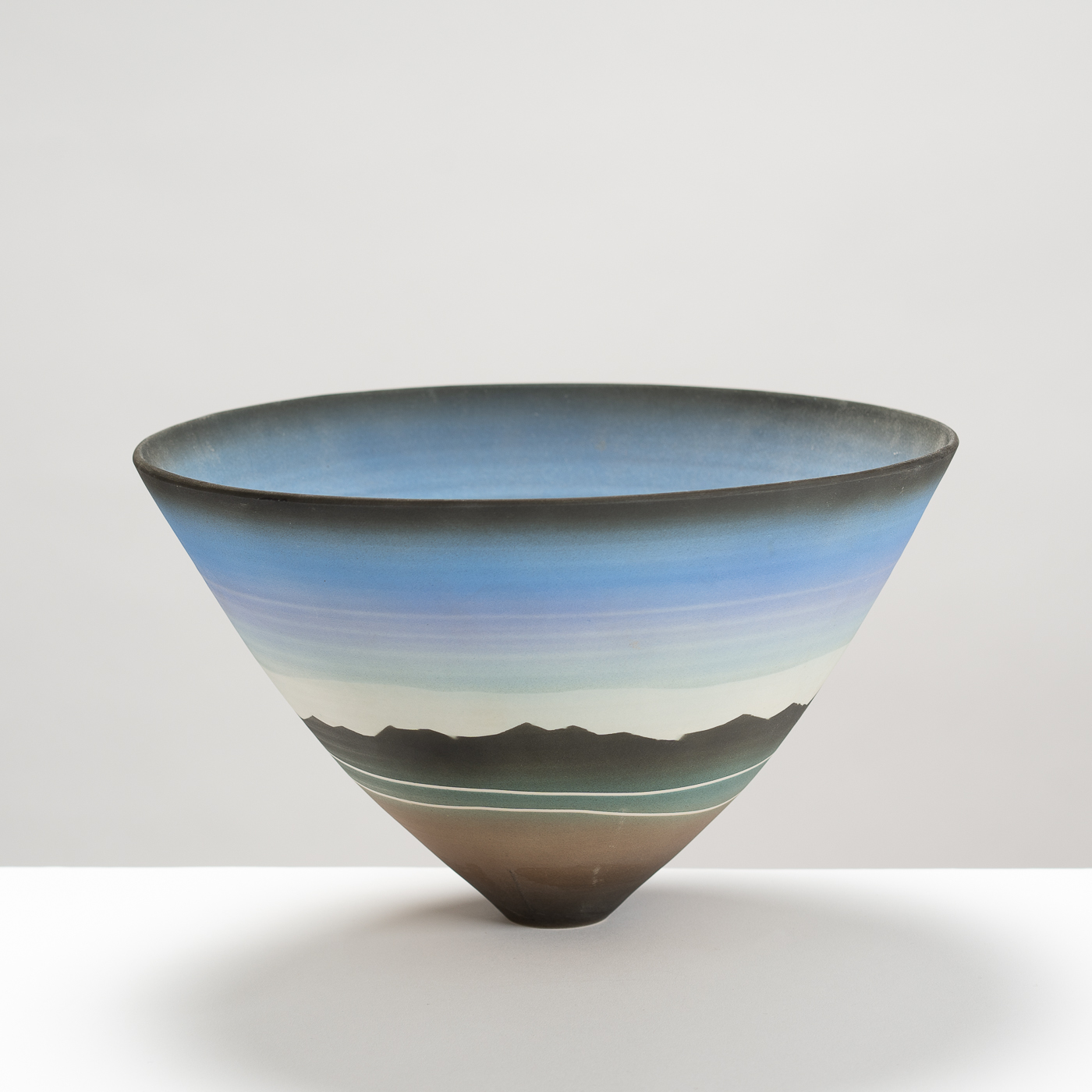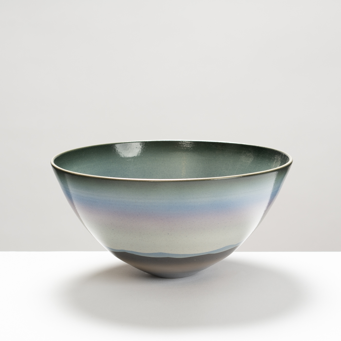 Porcelain, with its fine texture, purity and whiteness, allows Peter to explore relationships between form and surface in a way that is more rewarding than with any other clay. Wheel-thrown vessel forms offer infinite opportunities for subtle variations, but his particular concern, while attempting to achieve harmony and balance in the work, is to express his feelings for the natural world through the positive radiation of light and colour.
