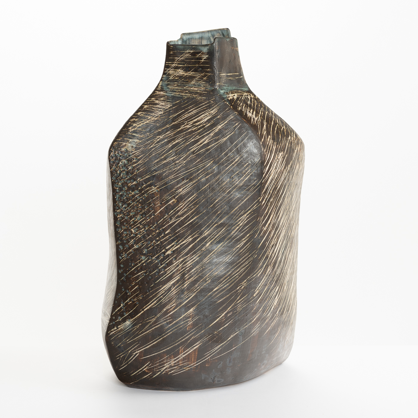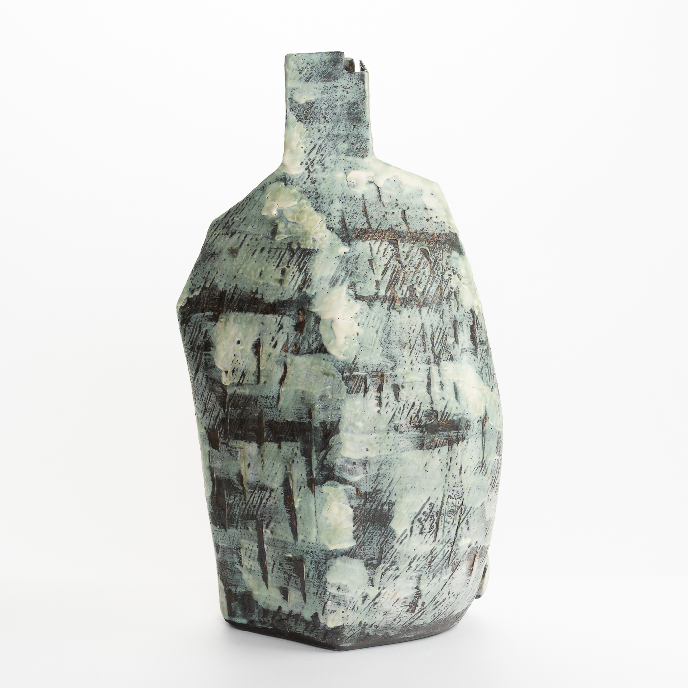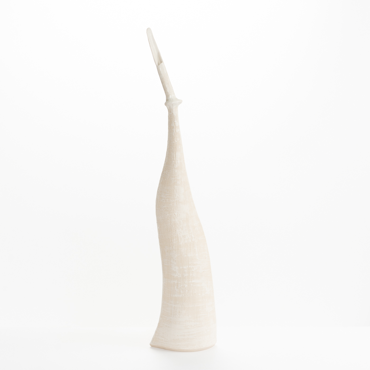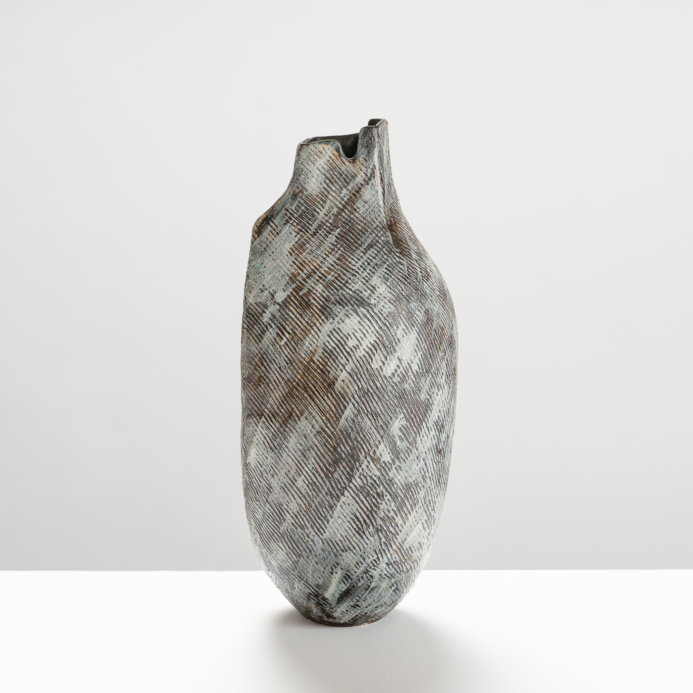 The slow repetitive hand-building techniques she uses to create her pieces offer a considered way to develop the work as each piece calmly grows. Deliberate junctions are made by breaking and re-joining the form where collars or shoulders then evolve. Surface markings are infused into the work during the making, with slips and oxides being applied throughout the drying stage. Built with a white stoneware clay body, the work may be glazed or left bare.
